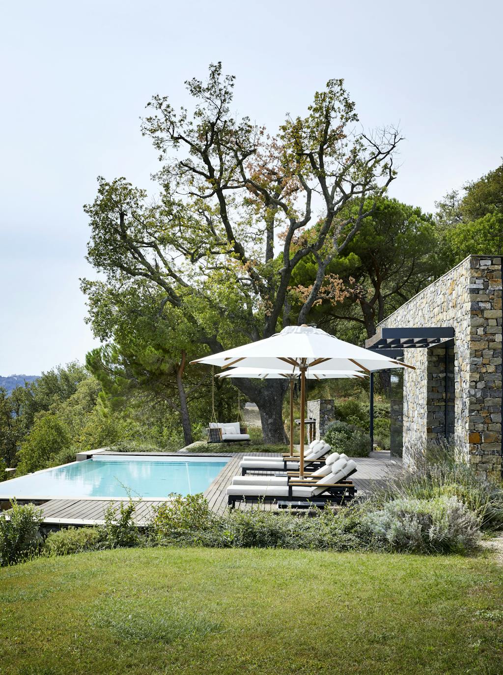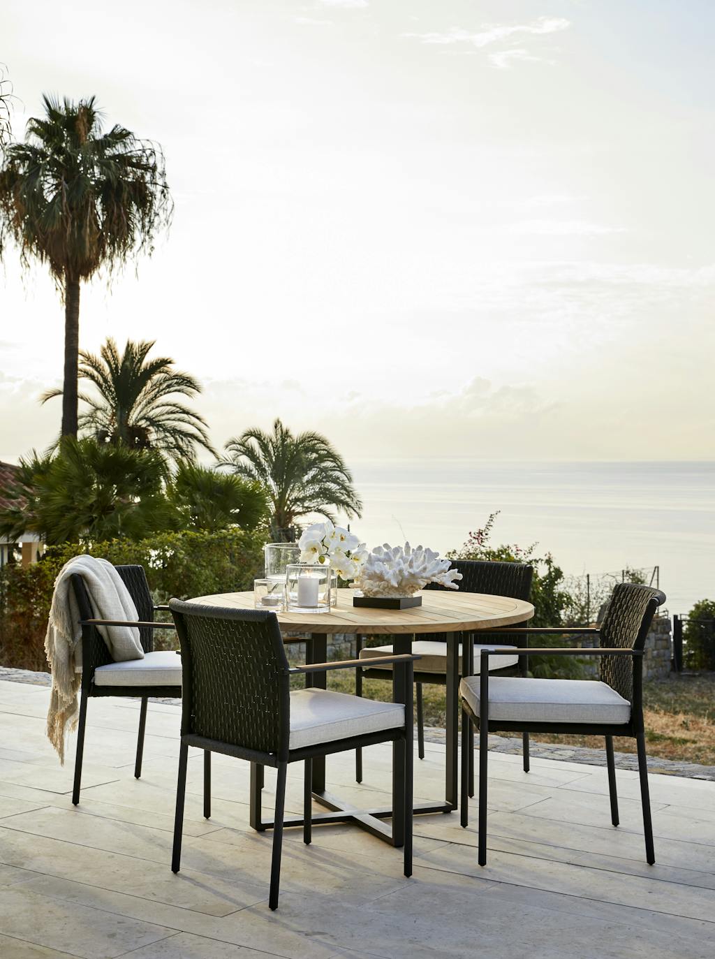 Materialemikset på møbler og detaljer, der varierer fra aluminium til teak og flet, giver et spændende, men tilpas minimalistisk udtryk, som udtrykker balance mellem det organiske og det hårde – og lader den omgivende natur komme til sin ret.