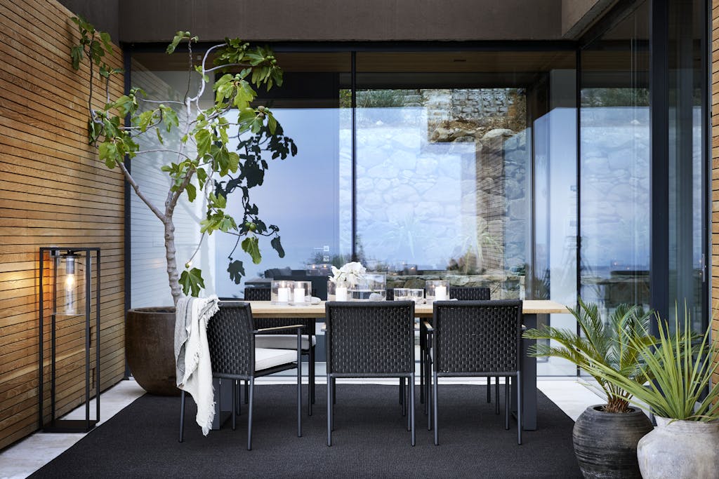En x-factor i al indretning er interiørdetaljerne, og i denne bolig gælder det også udearealerne. På bordene i de hyggelige spisegrupper skaber planter i dekorative potter, lysestager og lamper i glas og små, skulpturelle indslag varme og personlighed.