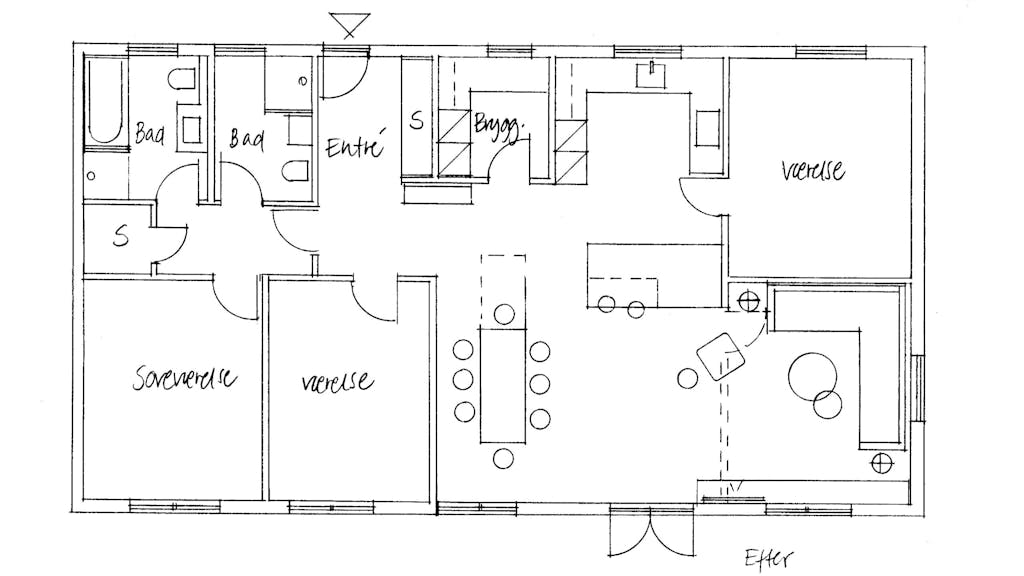 Jeres nuværende entré er meget lille, hvorfor der er et stort garderobeskab inde i gangarealet. Det kan I ændre ved at tage noget af pladsen fra bryggerset og derved få plads til et stort skab i entreen. Samtidig med det har jeg flyttet døren til bryggerset fra køkkenet og ud i gangen, så I får en lukket væg i køkkenet at møblere opad med højskabe osv. Jeg tænker at bryggersdøren i facaden er unødvendig, så den er lukket og erstattet af et nyt vindue, så I kan møblere langs facaden som vist.