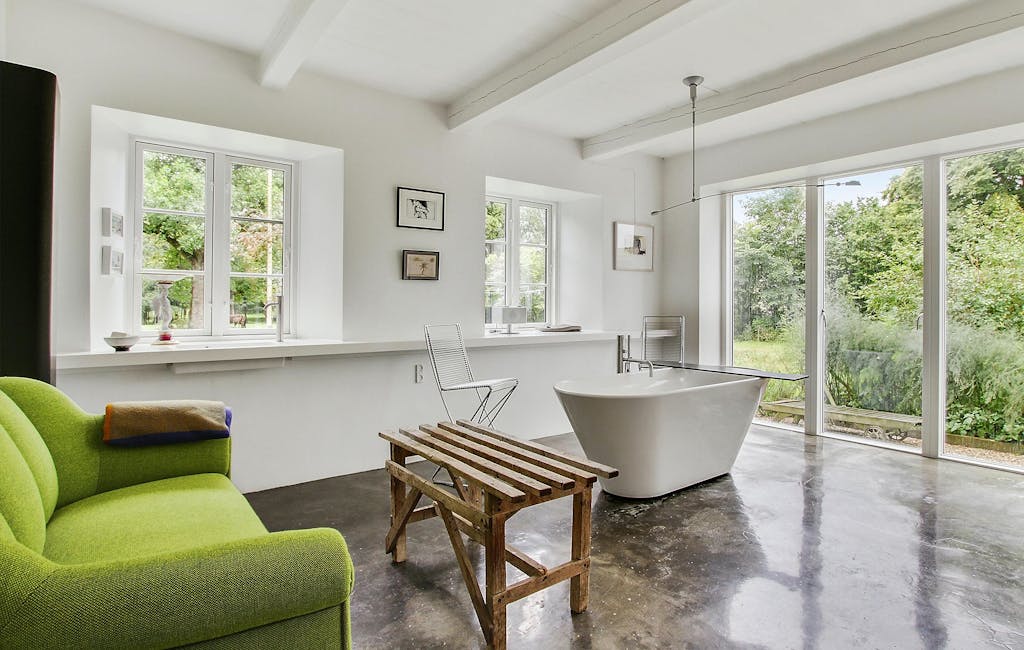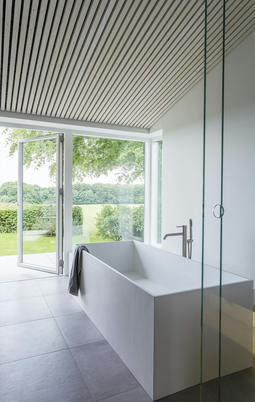 Med masser af gulvplads kommer et fritstående badekar rigtig til sin ret. Også dette høje kar, der er omgivet af et stort betongulv og en fantastisk udsigt til en stor grøn have gennem det store glasparti.