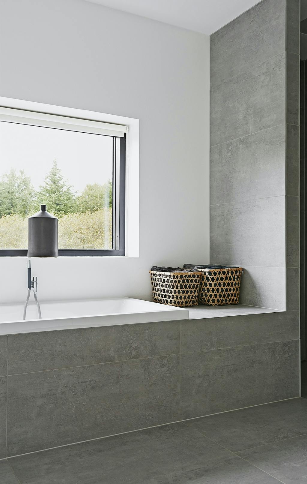 Det har arkitekt Lars Bo Poulsen gjort her i dette nybyggede hus, hvor badeværelset og badekarret er beklædt med matte fliser i betonlook.