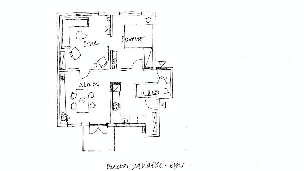 Flytter du soveværelset som foreslået, kan du isætte en skydedør imellem opholdsstue og soveværelse, hvorved du undgår en generende dør, og måske lave en større åbning imellem stue og alrum. Det er højst sandsynligt en bærende væg, så det koster noget, men at få dagslyset igennem lejligheden ville jo være skønt for dig.