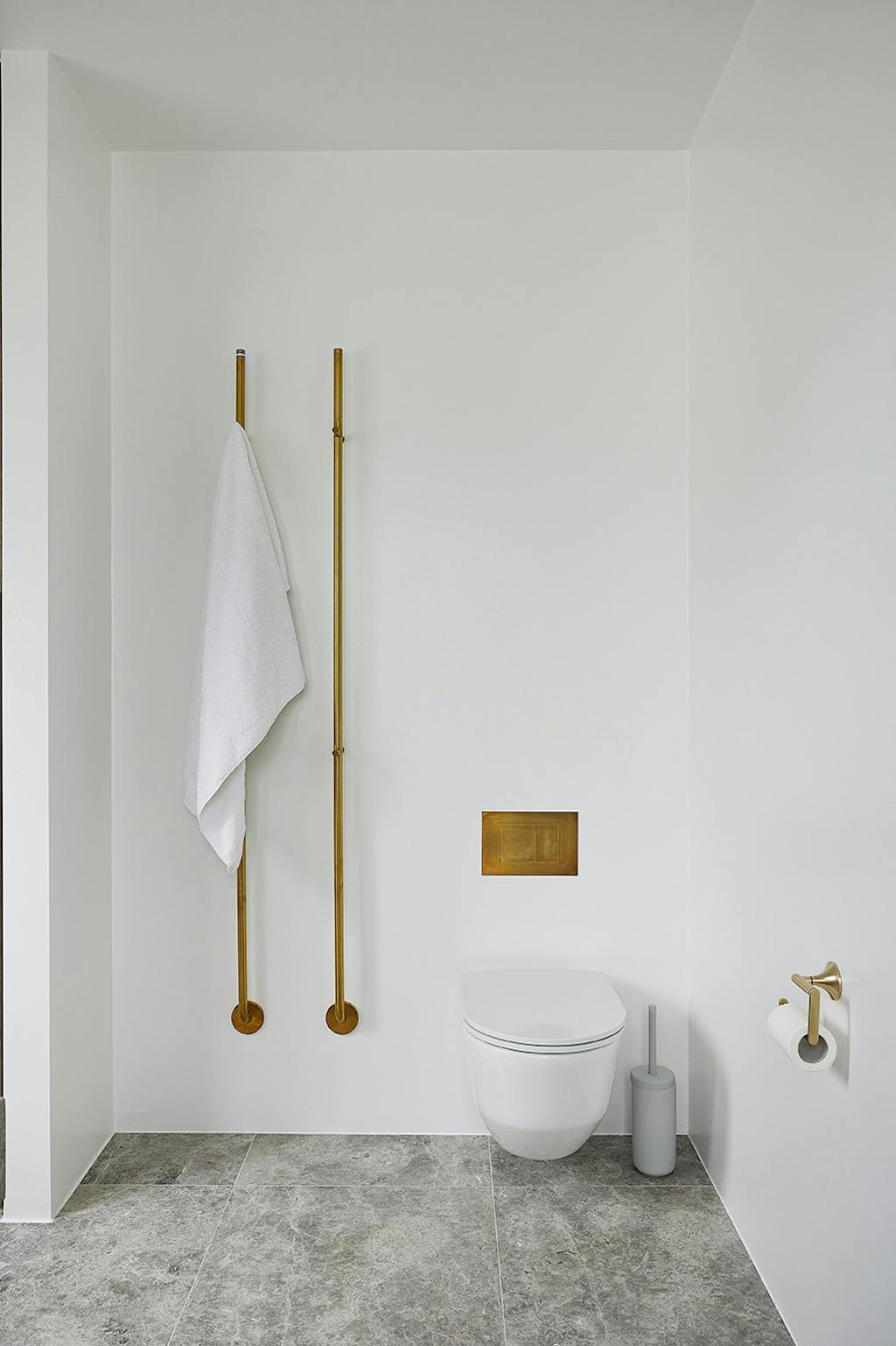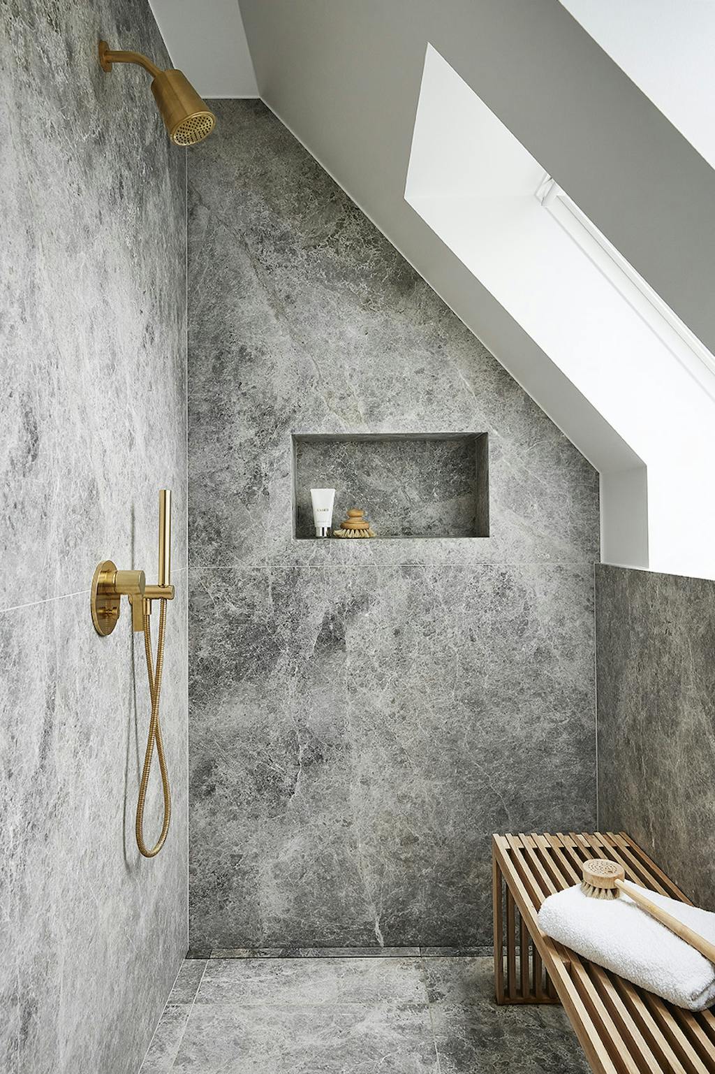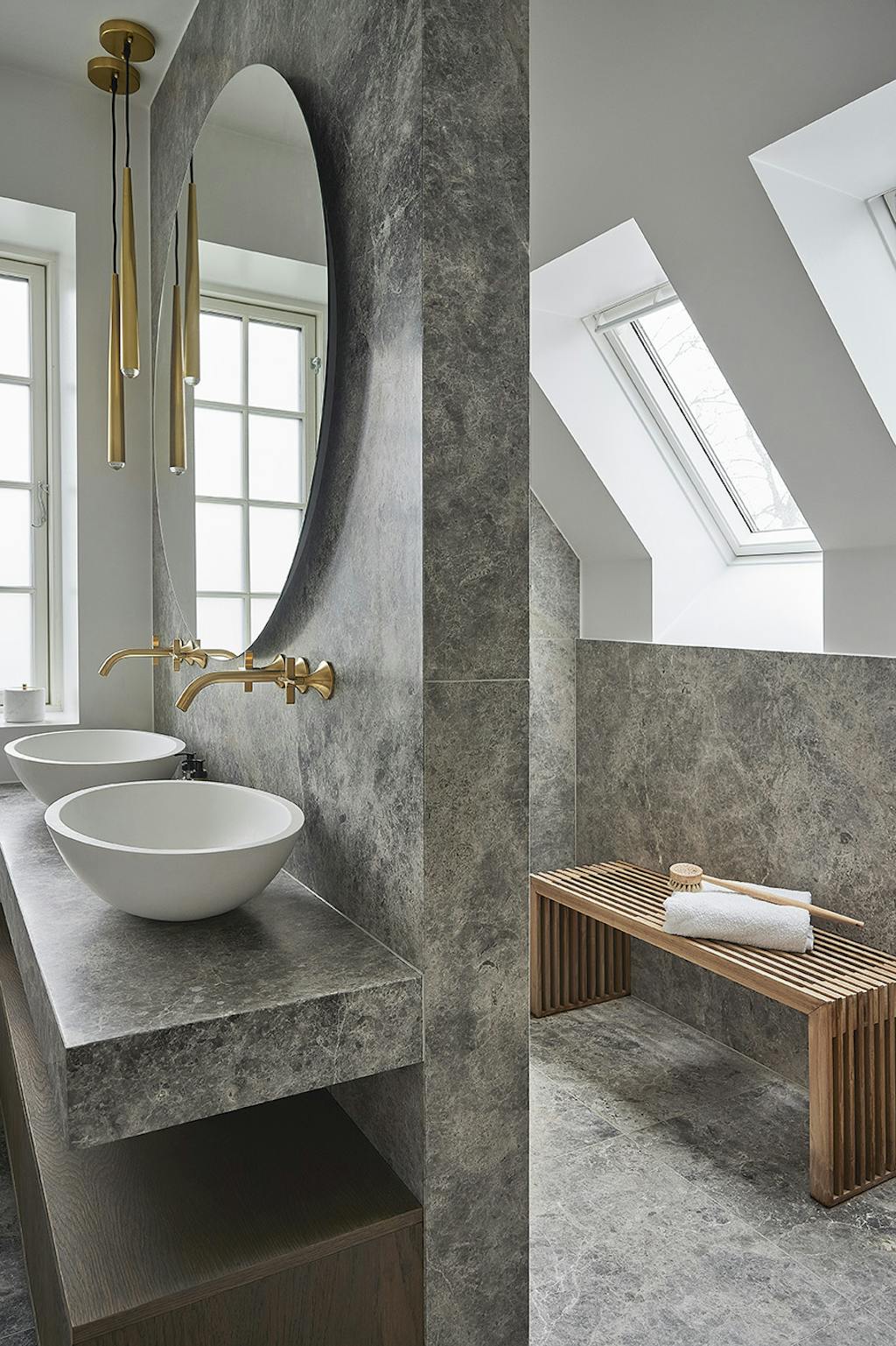 Ejerne havde et særligt ønske om, at der skulle bruges naturmaterialer, så derfor faldt valget på natursten til vægge og gulv: den eksklusive tundra grey-marmor, som er kendetegnet ved at være unik i sit mønster, sin smukke polerede glans, og at den er holdbar, hvilket er vigtigt, når den skal bruges til boligindretning. Ud over marmor er de gennemgående materialer i badeværelset messing og olieret egetræ.