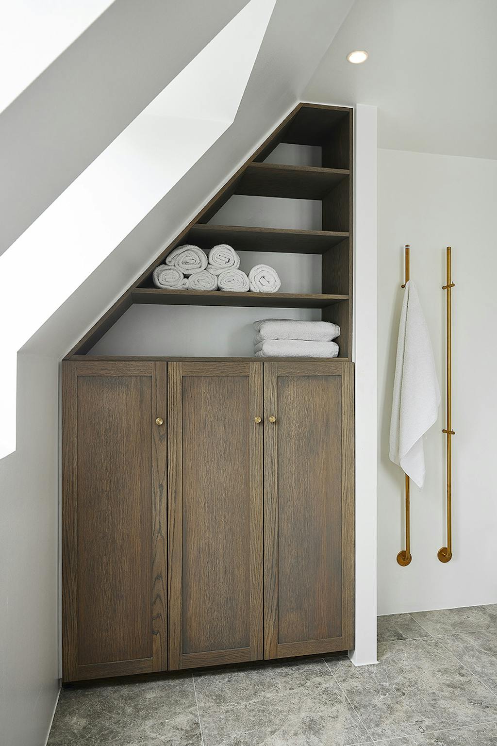 For at give badeværelset en rigtig spastemning er der etableret en væg, der adskiller toilet og spejlrum fra brusebadet. Væggen deler rummet i to og har givet et større bruserum og mulighed for et indbygget skab. En skøn bonus er, at man kan bruse, imens man nyder udsigten fra husets ene tagvindue.