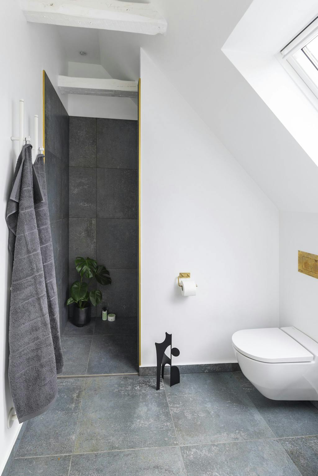 – Minimer synsindtryk på badeværelset. Det giver ro. Af samme årsag er loftsbjælkerne malet hvide på mit badeværelse – så skal man ikke forholde sig til kontrasten, men de fremstår stadig synlige og fortæller en historie.