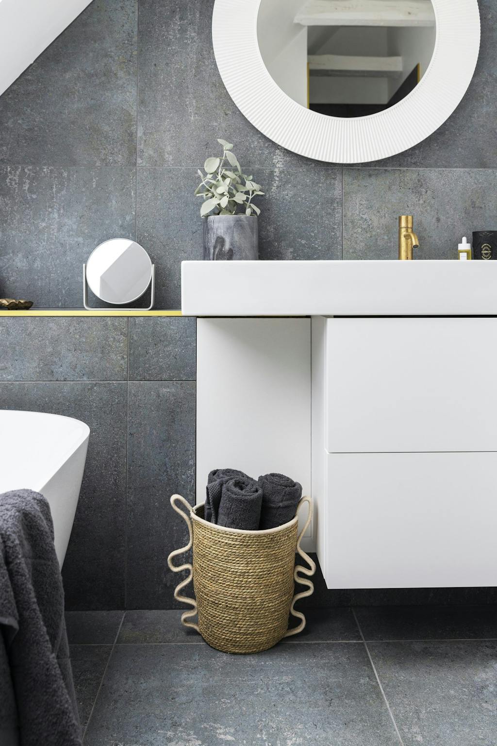Selvom loftsbjælkerne er malet hvide, har Anja stadig tænkt i kontraster på badeværelset. Brugen af kontraster er med til at skabe dynamik i et rum, men de kan indtænkes på forskellige måder og i forskellige grader. På badeværelset har Anja haft fokus på de mere rolige kontraster.