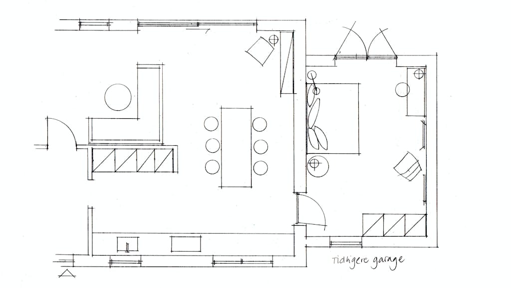 I forhold til jeres køkkenindretning og spisebordets placering kan I vælge at placere værelsesdøren enten tættest på køkkenet – hvilket freder stuehjørnet, eller i hjørnet ud mod haven. Jeg ville vælge den første løsning, da det giver en meget naturlig adgang og et godt flow i forhold til jeres alrum.