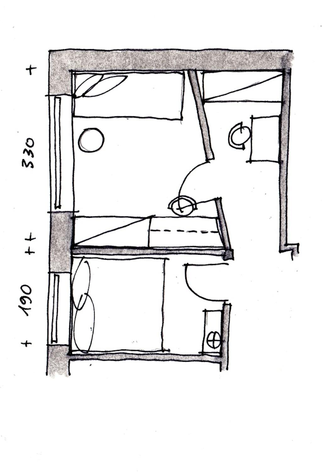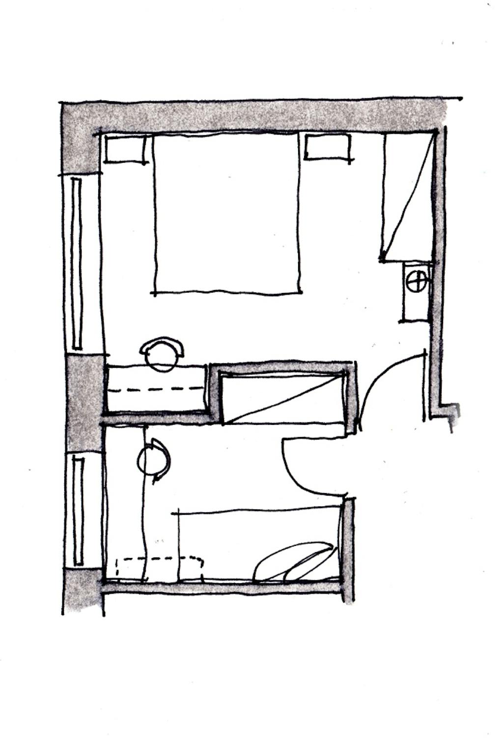 Men vi har 3,5 dobbeltskabe og et skrivebord stående i soveværelset, det kan ikke være i det lille værelse. Derfor tænker vi på, om vi kan dele det store værelse op, så der bliver et (større) værelse til vores datter og et lille arbejdsværelse med skabe til os.