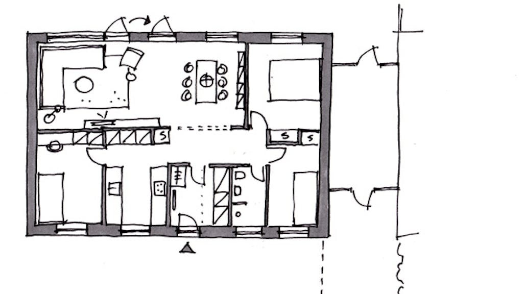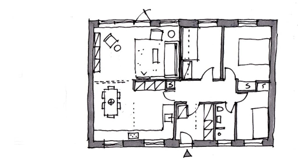 Forslag 1 er således en mere åben plan hvor væggen ind til stuen er lagt ned lige overfor den større og lysere entre, så fællesarealerne hænger sammen med åben adgang til køkkenet. Det lille kammer for enden af stuen er nedlagt for at få plads til ny spiseplads, og spisekrogen er så lukket af og lavet til værelse. I så lille et hus er det værdifuldt at kunne åbne gangens m2 og gøre dem mere brugbare.