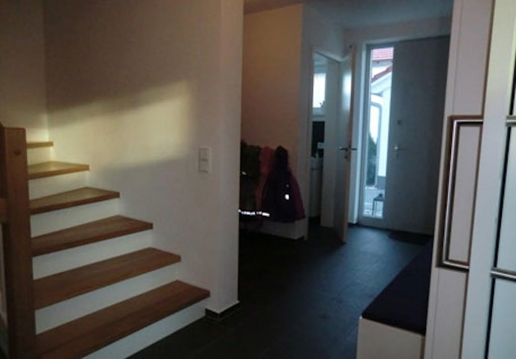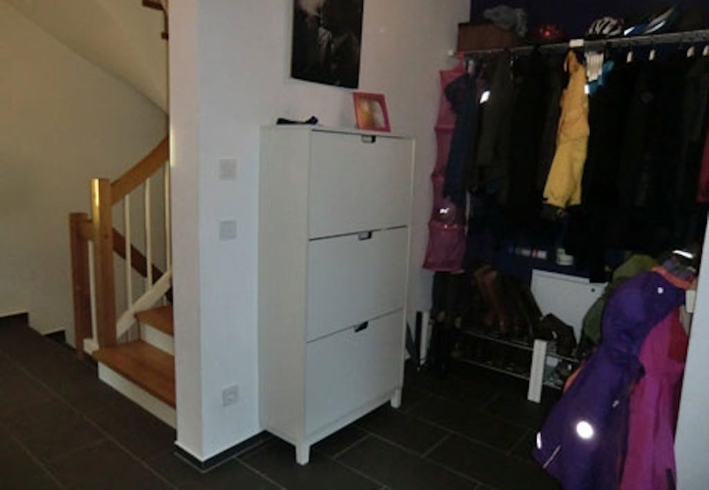 Min mand og jeg byggede for ca. tre år siden hus (den ene halvdel af et typisk tysk dobbelthus på 2 etager + loft og kælder) i udkanten af München og var fra start enige om, at vi ville have en rummelig og praktisk indgang, hvor vores 2 piger havde plads til at komme i og smide overtøj og støvler, uden at vi alle faldt over hinanden. Desværre fungerer indretningen ikke rigtigt og er hele tiden en torn i øjet på mig, når vi skal igennem gangen for at komme ovenpå, i kælderen eller på gæstetoilettet. Det hele virker lidt nøgent og usammenhængende. Jeg savner en rolig og indbydende indgang.