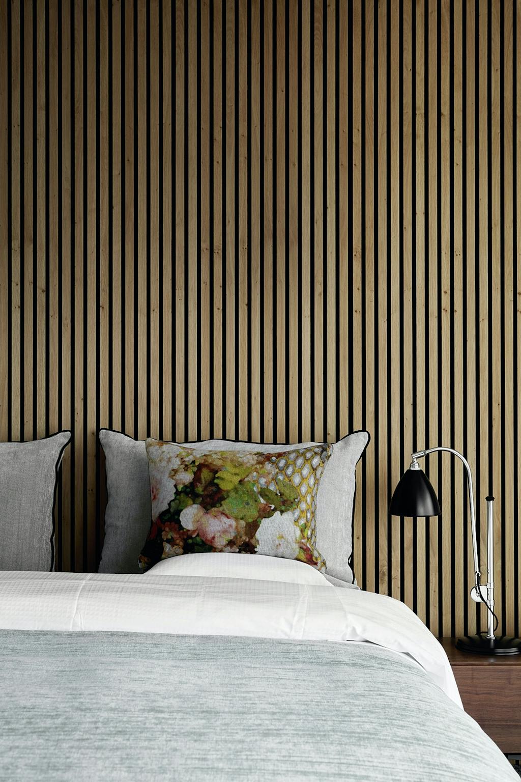 Parret, som bor i hjemmet, ejer virksomheden Living Art og har selv stået for indretningen. De har hængt lette gardiner op, så de skærmer for det skarpe lys, men bevarer udsigten, og mørkegrønne velourgardiner kan gøre rummet helt mørkt, når der er behov for det. Bag sengegavlen har parret sat akustikpaneler op i egetræ, som sikrer, at rummet er helt roligt. Derudover har de indrettet med sengeborde i valnød og et brunligt silketæppe, som samler rummet og understøtter følelsen af at være midt i naturens eget farvespektrum.