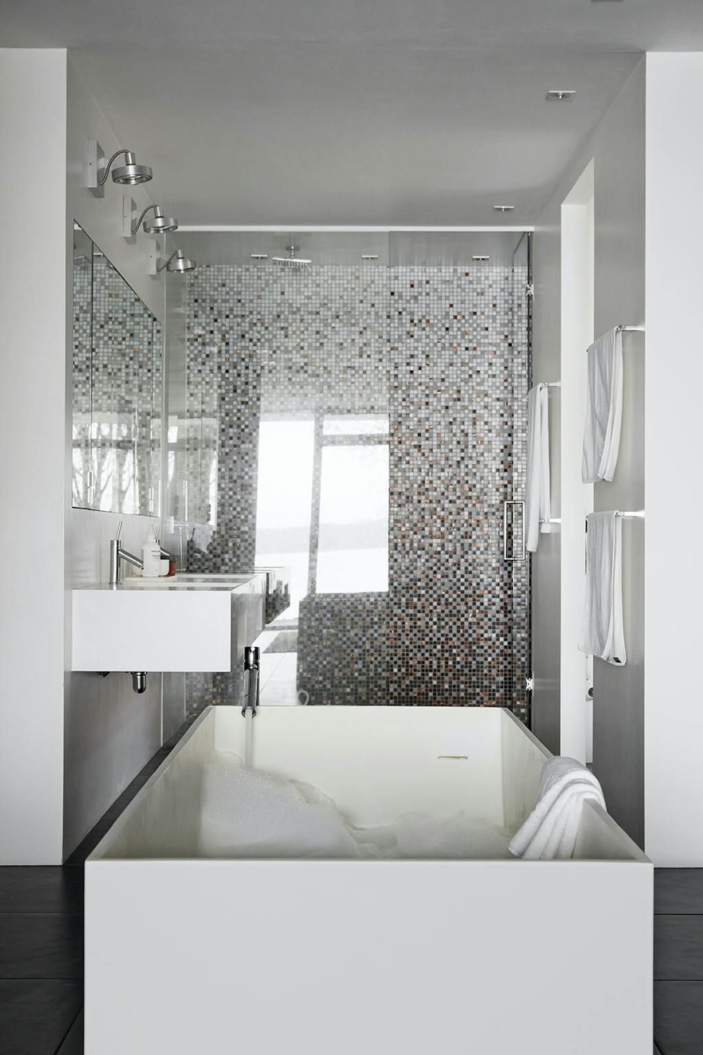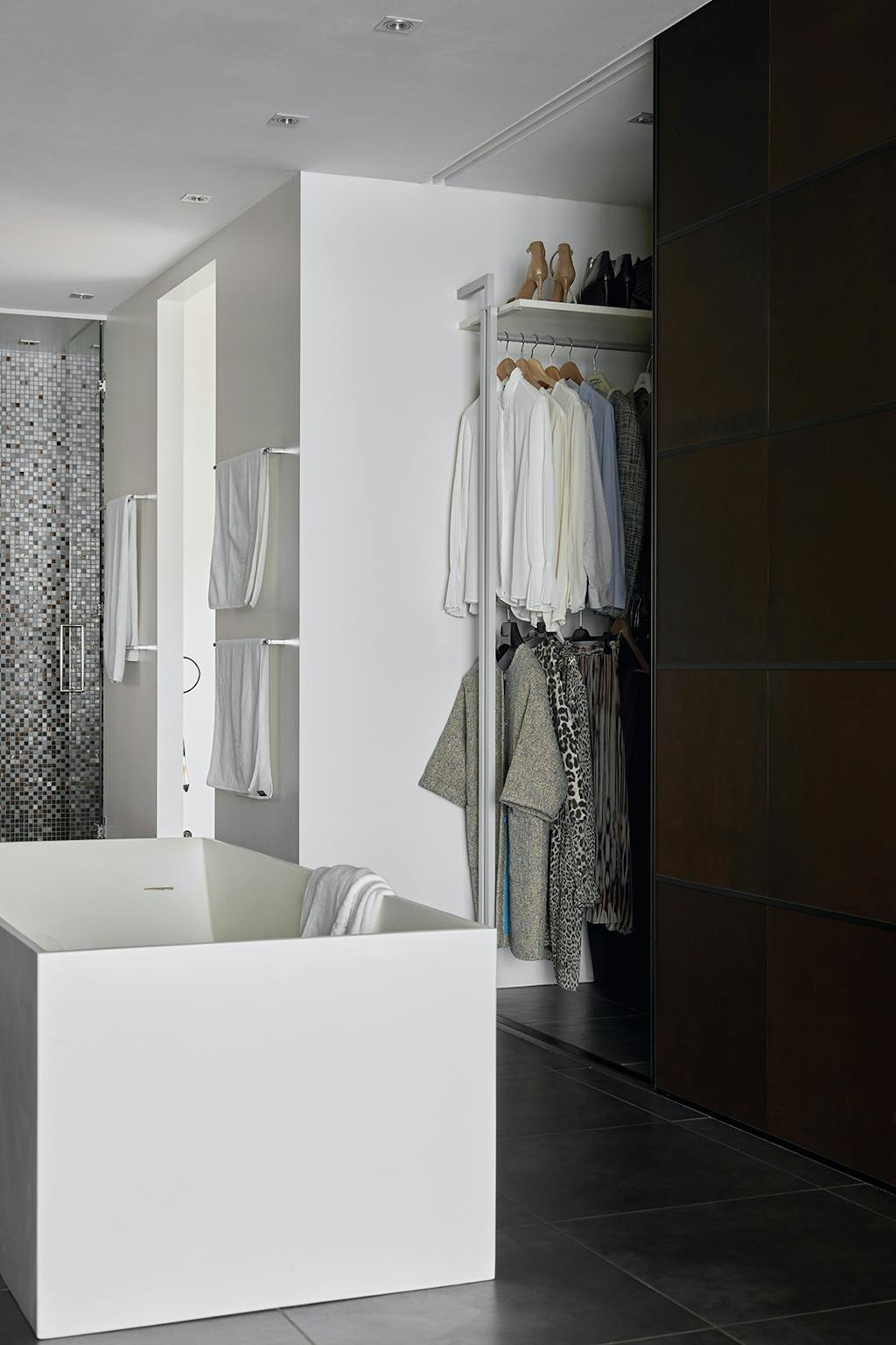 Parret, som bor i huset, elsker at rejse og opleve nye byer, lande, hoteller og restauranter, og derfor tegnede de deres soveværelse og bad, så de hver dag ville føle, at de vågnede i en luksussuite på et godt hotel. På deres badeværelse, som ligger i forlængelse af soveværelset, har de derfor sørget for alle moderne faciliteter, som dampbad, to brusere, separat toilet, badekar med udsigt, lækre tæpper og kvalitetshåndklæder.