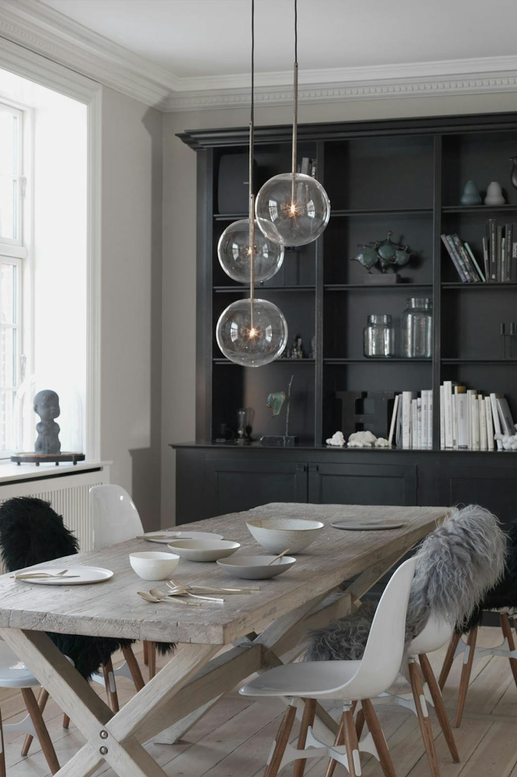 Hjemme hos Lene Halse Hornemann er spisestuen indrettet med en stor sort reol, der er placeret langs endevæggen. Reolens nederste hylder er lukket til med låger, hvor familien har mulighed for opbevaring. Reolens øverste hylder er åbne og her er hylderne udnyttet til at udstille simple vaser og bøger, der er sorteret efter farver.