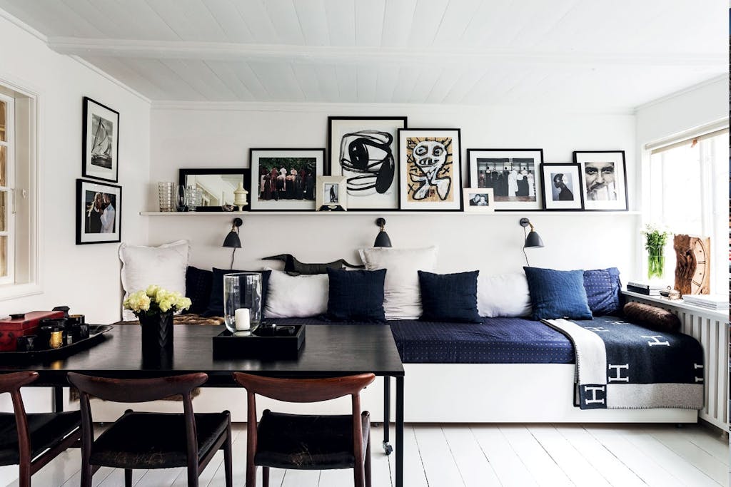 Huset i West End i London har været igennem en stor renovering og er blevet til et vidunderligt moderne hjem. I dagligstuen er der en speciallavet reol, som ejerne blandt andet bruger til opbevaringsplads af en samling af værker, der købt med hjem fra rejser og markeder. Den nederste del af reolen er malet i en blå nuance, der matcher endevæggen. Ved at placere fjernsynet i en niche i skabet, er det lykkedes at få fjernsynet til blende ind i rummet. Et speciellavet reolsystem hjælper dig desuden til at få udnyttet pladsen bedst muligt i dit hjem, specielt hvis du har skråvægge.
