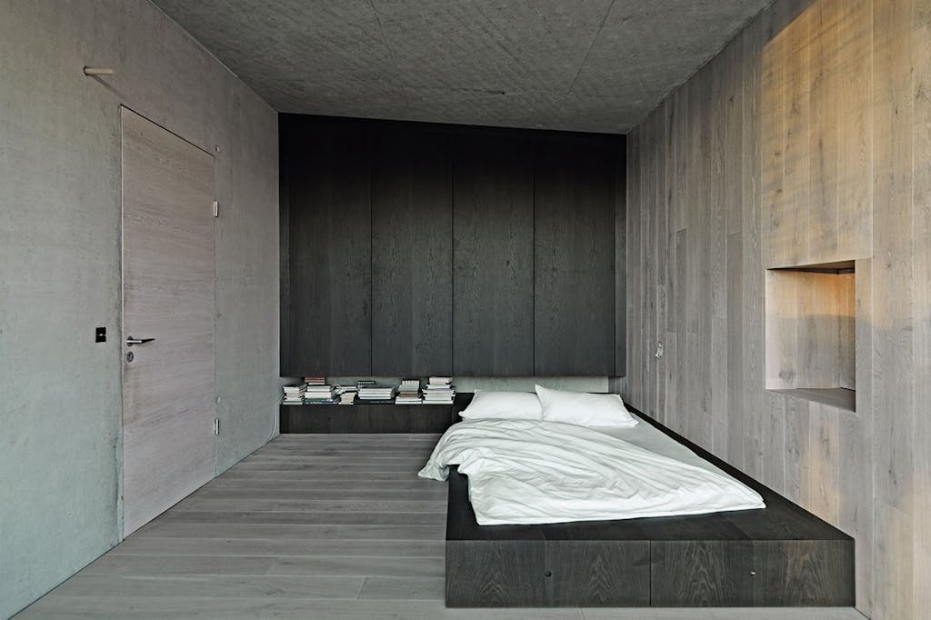 Arkitekt Manfred Lux har bygget sit drømmehus på en skrænt ned til floden Schmutter i Tyskland. I soveværelset under sengen, er der skuffer til opbevaring og i den mørke trævæg bagerst i soveværelset er der indrettet skabe. Som en ekstra fin detalje, er der er luft mellem skabe og skuffer, så de kan anvendes som sengebord.