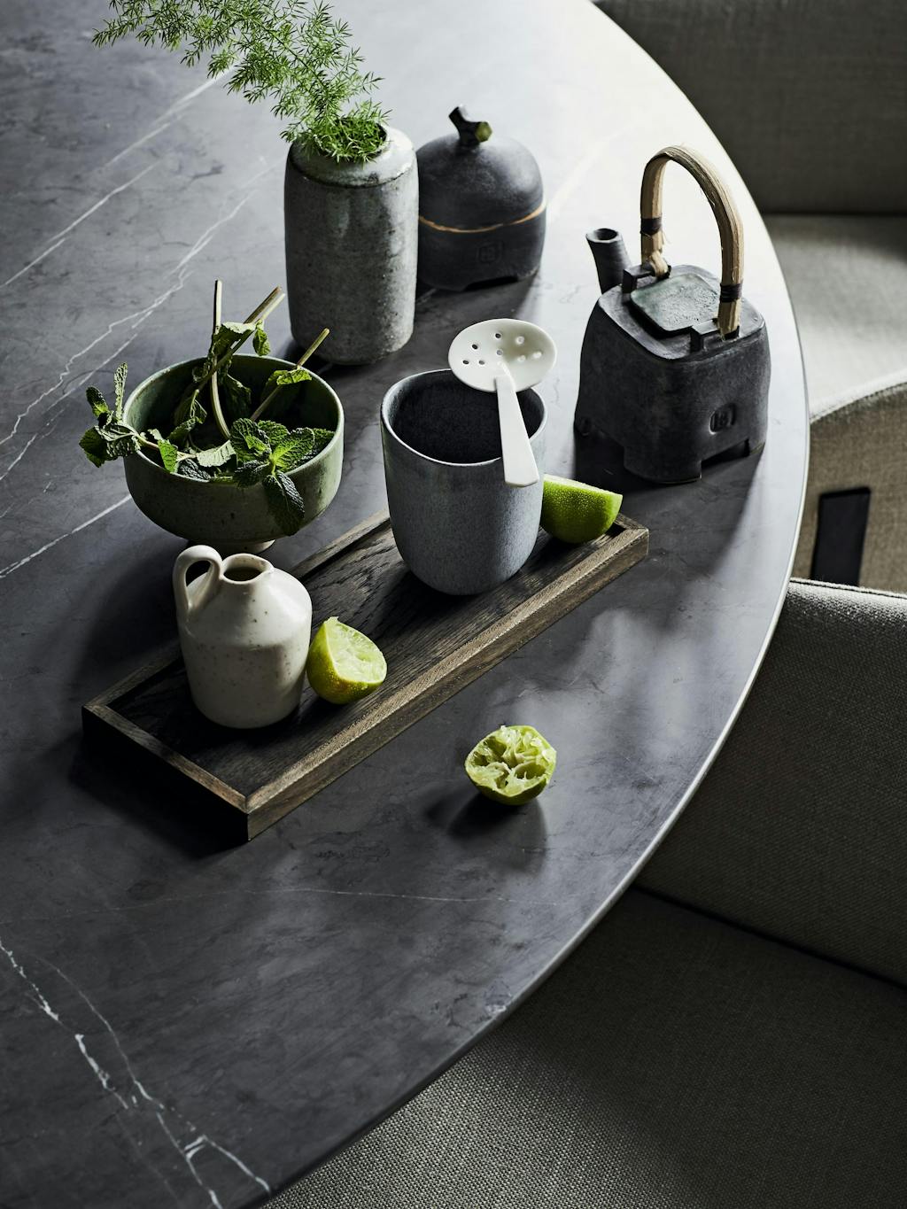 Rundt spisebord, De Padova Tavolo 95, design af Archille Castiglioni, diam. 180 cm, i Greystone natursten, 59.428 kr., samt stol, Chesto, polstret tekstil med træben, 10.659 kr., De Padova/Bo