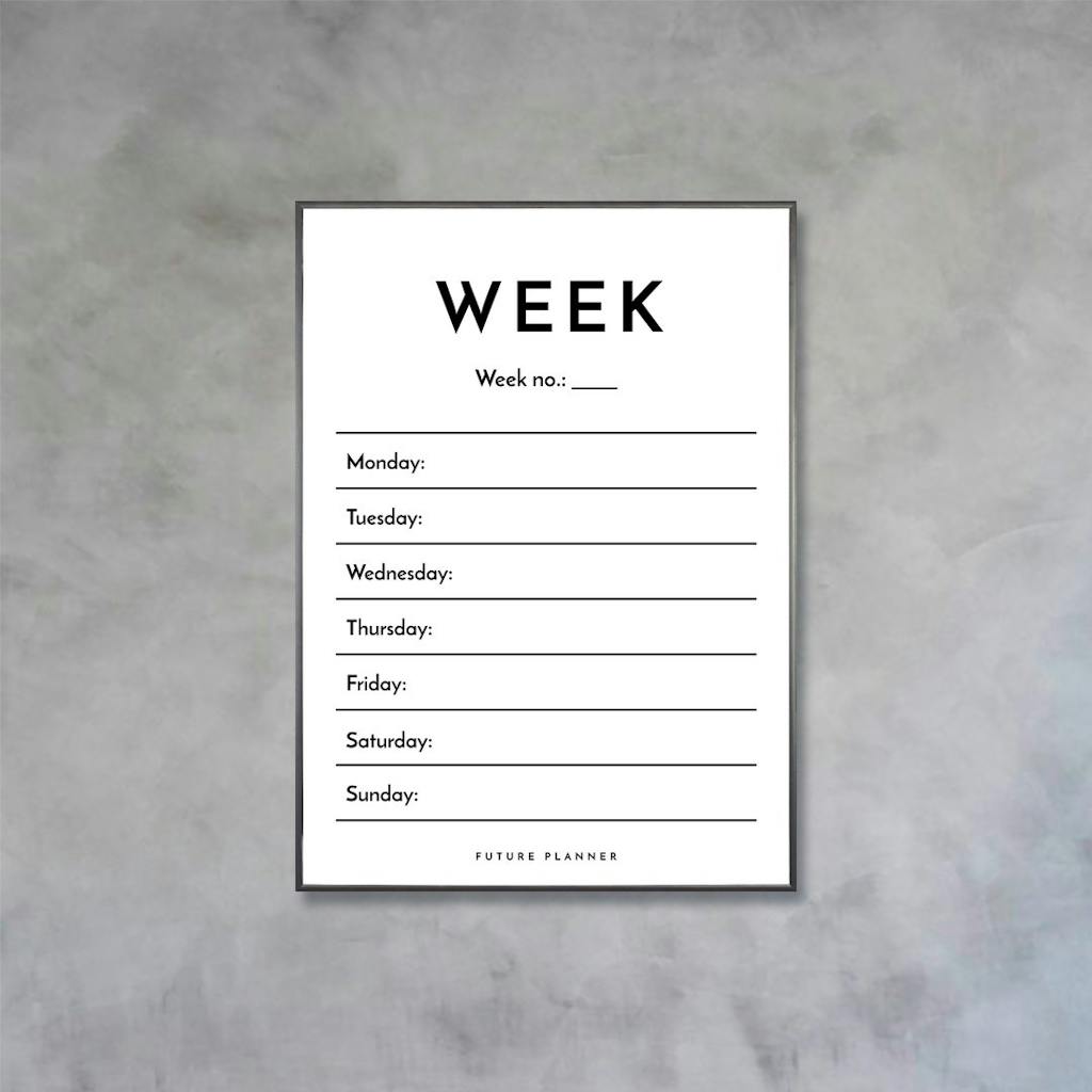 Denne kalender hjælper dig med at skabe overblik over en uge ad gangen. Kalenderen kommer i en billedramme med glas og tuscher til at skrive med. Skriv dine planer direkte på glasset, og når en uge er slut, så kan du viske kalenderen ren og starte forfra. Kalenderen kan genbruges uge efter uge og udløber aldrig.
