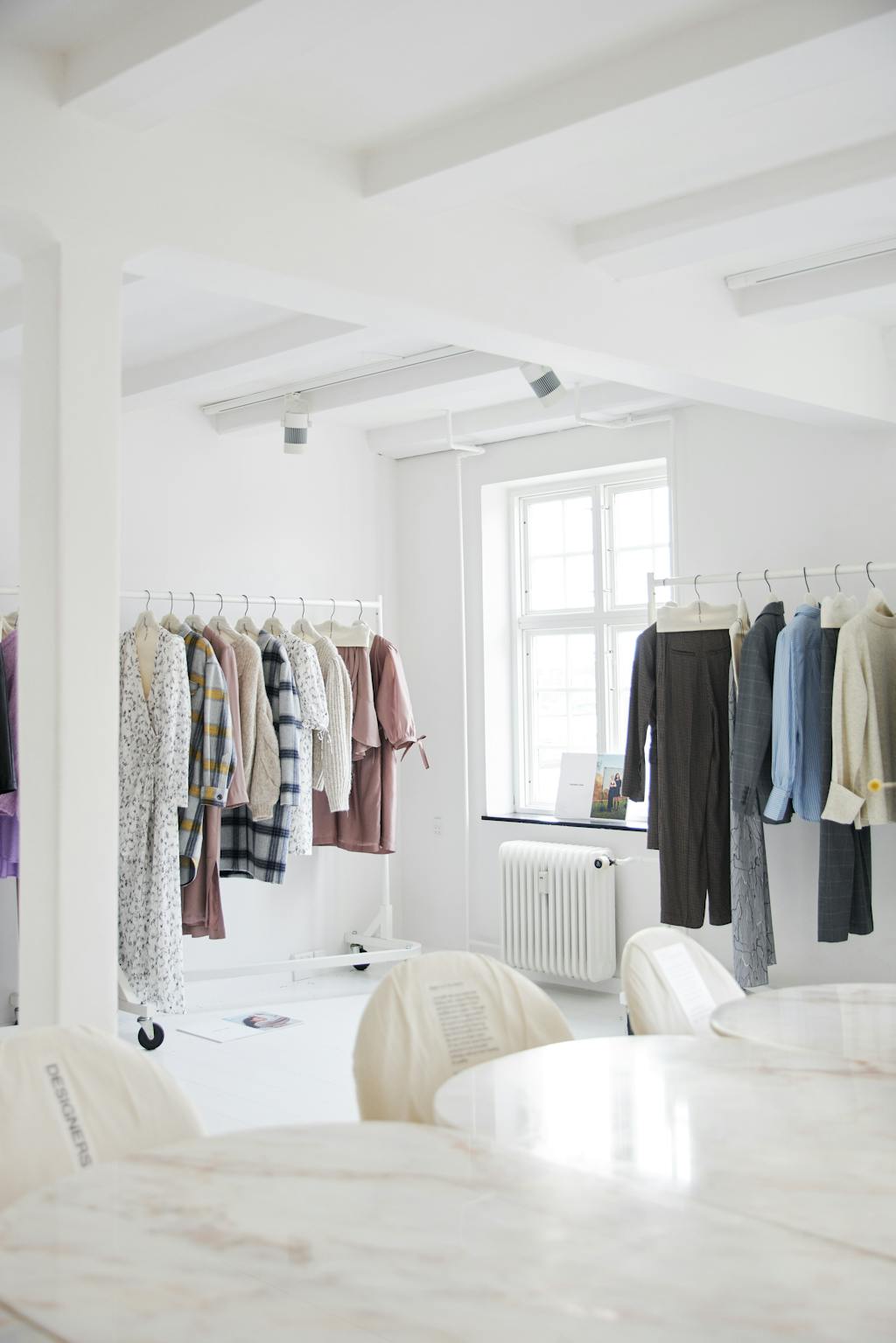 Rene, hvide linjer trækker paralleller til følelsen af at være i et galleri - en smuk baggrund at vise brandets tøjdesign på.