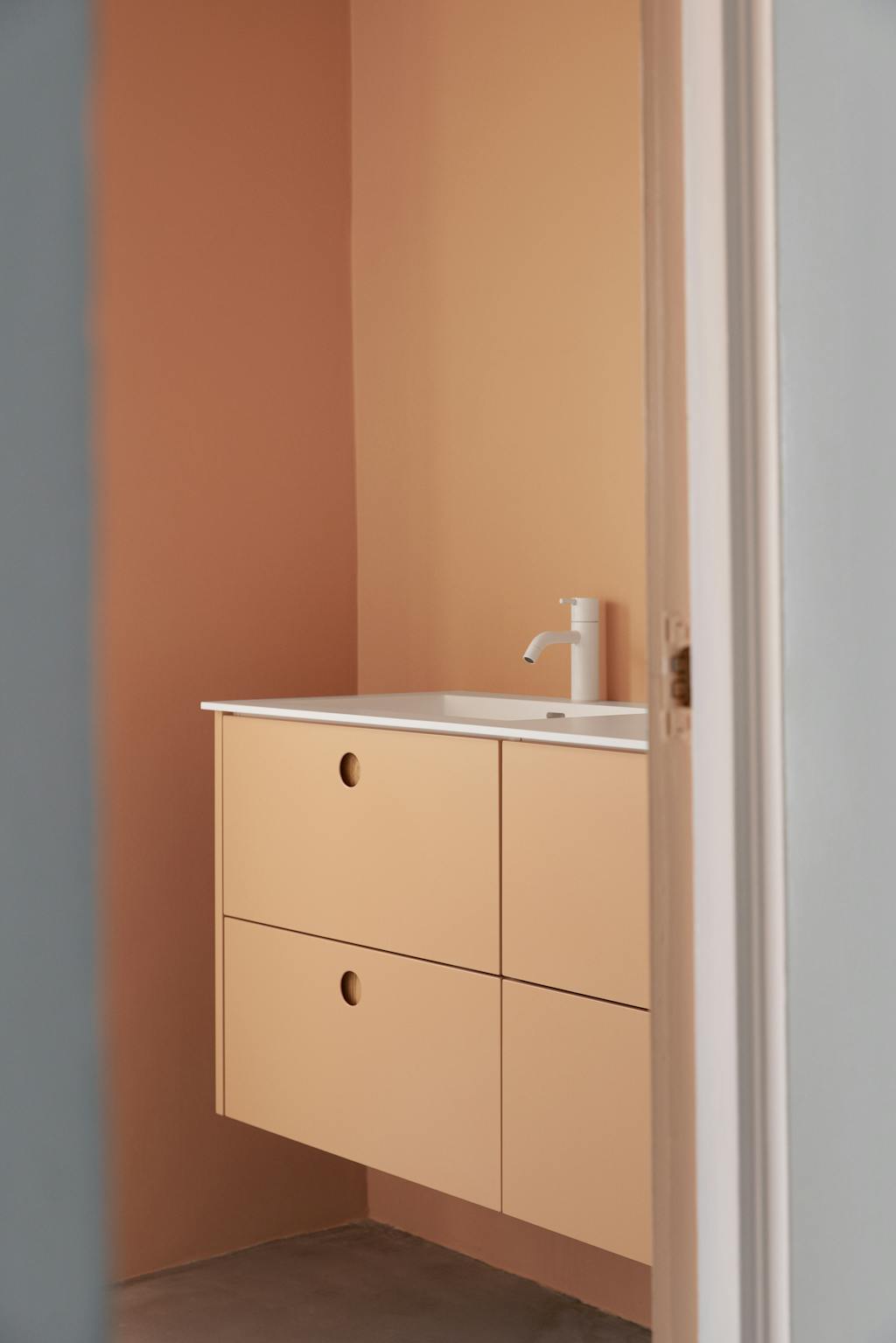 – Toiletterne føles meget pulverlakerede, helt som kvinders såkaldte 'powder rooms', som jo er beregnet til, at kvinder skal lægge makeup. Den hvide vask, den hvide bordplade og det hvide armatur mod de varme farver giver rummene en moderne følelse.