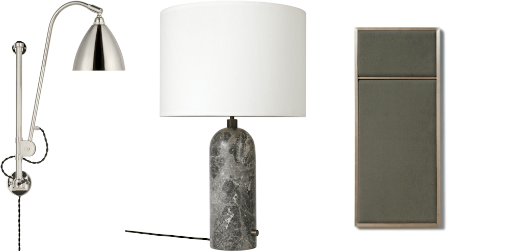 Alle værelser på Hotel SKT. Annæ er holdt i afdæmpede farver, der virkelig giver plads til, at de små detaljer og det gode håndværk kan være i centrum. Lamperne fra Gubi skaber i sammensætning en fantastisk kontrast mellem BL5's kølige metal og det naturlige marmor i Gravity Table Lamp. For at understrege de jordnære farver er Nouveau Pin fra Please Wait To Be Seated tilføjet, der både fungerer som en praktisk opslagstavle og akustikforbedrende i rummet.
