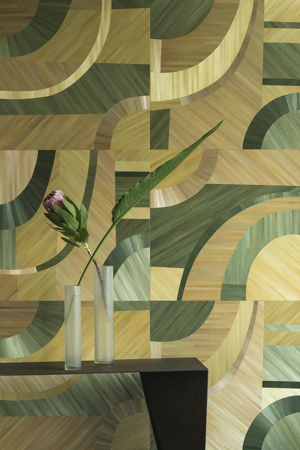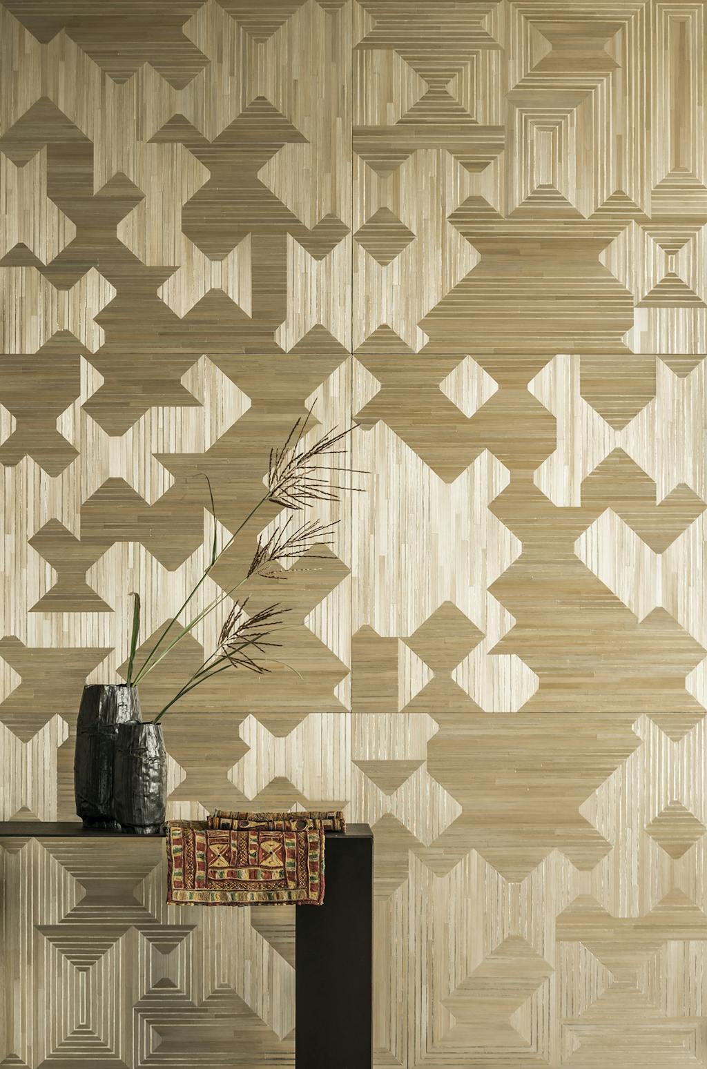 Ved at indfarve strå eller træ i forskellige mere eller mindre nuancer og kombinere disse i geometriske mønstre opnår Alexander Lamont en forbløffende effekt. Og hvor nogle af mønstrene nok vil være en anelse for dominerende i en kølig nordisk kontekst, er der andre, som vil se fantastisk ud på en enkelt væg, eller en del af en væg, i fx en entré.