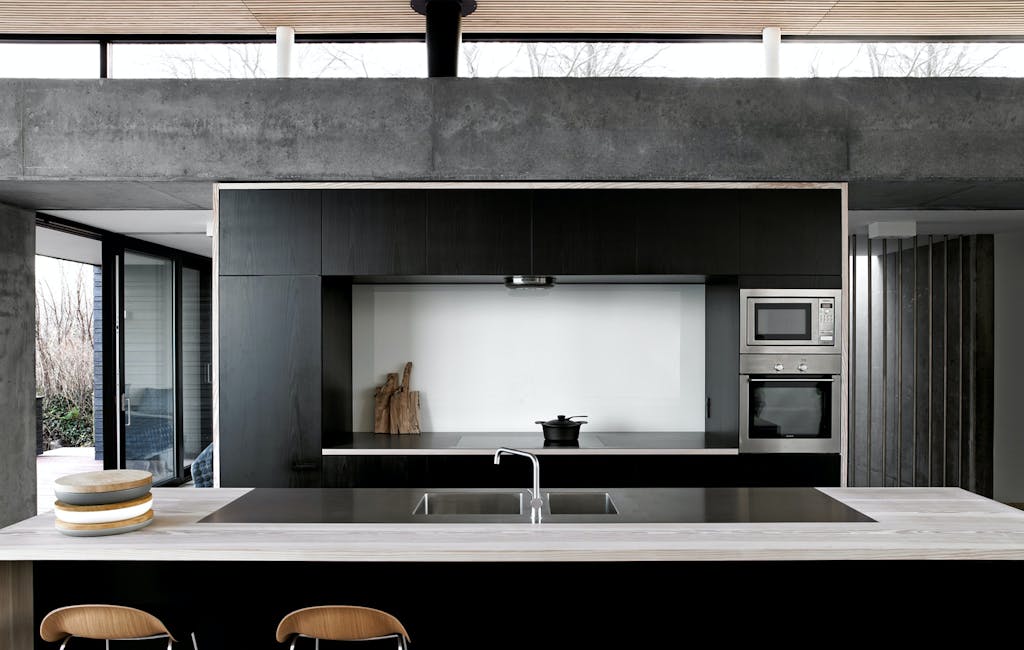 Under husets gennemgående og næsten brutale betonkonstruktion har arkitekt Niels Christoffersen placeret et fantastisk køkken. De sortmalede fronter og den gedigne bordplade af planker passer smukt til husets rene linjer og nordiske formsprog.
