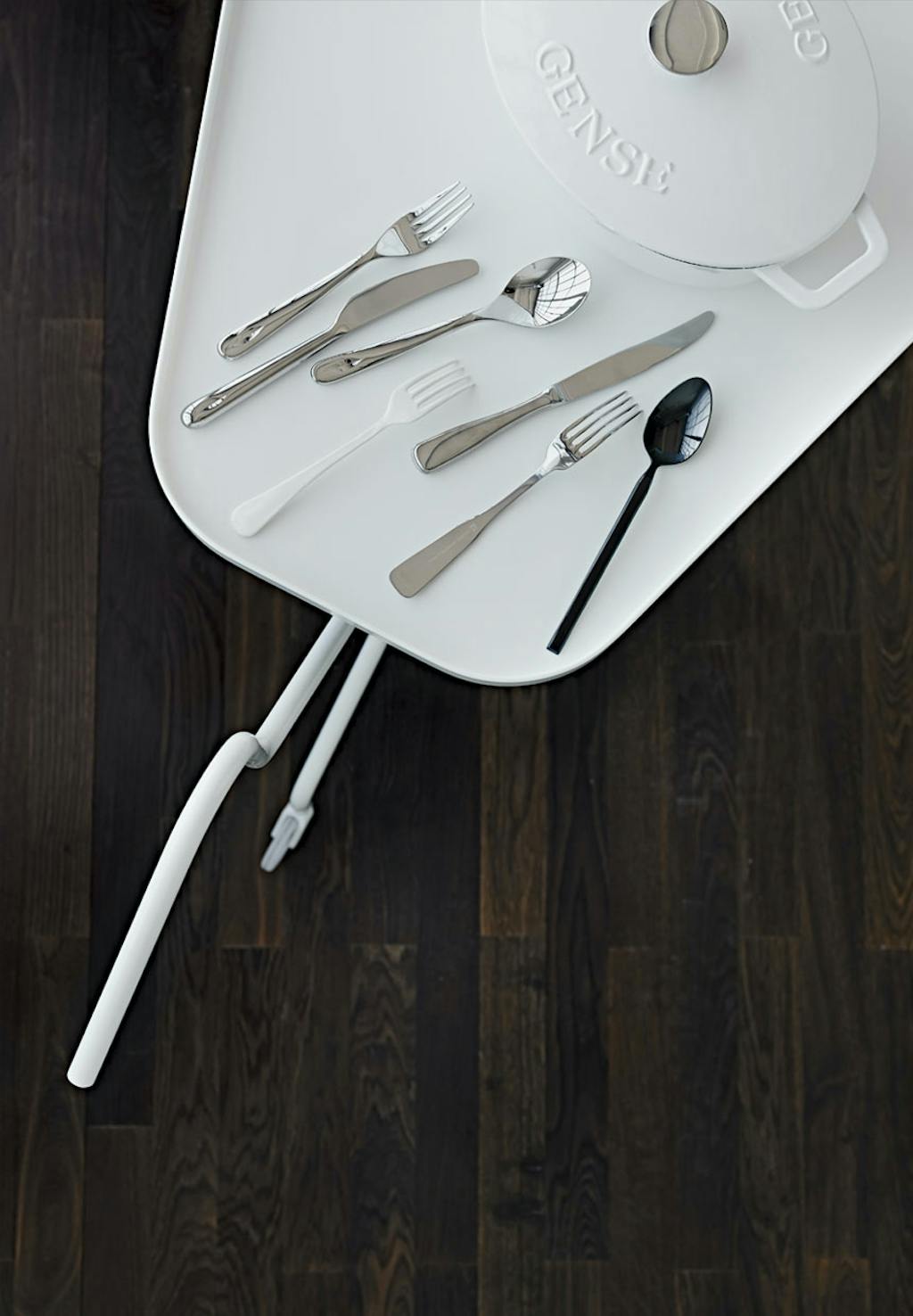 Tallerken Hammershøi, design Hans-Christian Bauer, i porcelæn, diam. 27 cm, 199 kr., Kähler. Sort tallerken i mangotræ, forarbejdet til, at man kan spise af den, diam. 20 cm, 89 kr., The Travelling Band. Bestik, Ichi Titanium, design Ole Palsby, fås som sæt og enkelte dele, middagsgaffel 220 kr., middagskniv 250 kr., dessertgaffel 150 kr., dessertske 150 kr., Ole Palsby Design. Glas Cobra Collection, mundblæst, 0,35 l, 2 stk. 229 kr., Georg Jensen. Mundserviet, 98 kr., Georg Jensen Damask. Bord, Base, design Mika Tolvanen, l 140 cm, 190 cm og 250 cm, fra 7500 kr., Muuto. Stol, CH88, design Hans J. Wegner, fås i flere farver, fra 3127 kr., Carl Hansen & Søn.