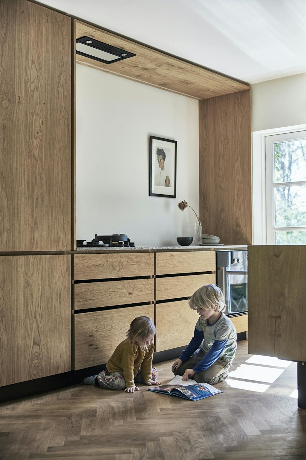 Sildebensparkettet binder køkkenets indretning sammen. Det er fra Nordparquet.