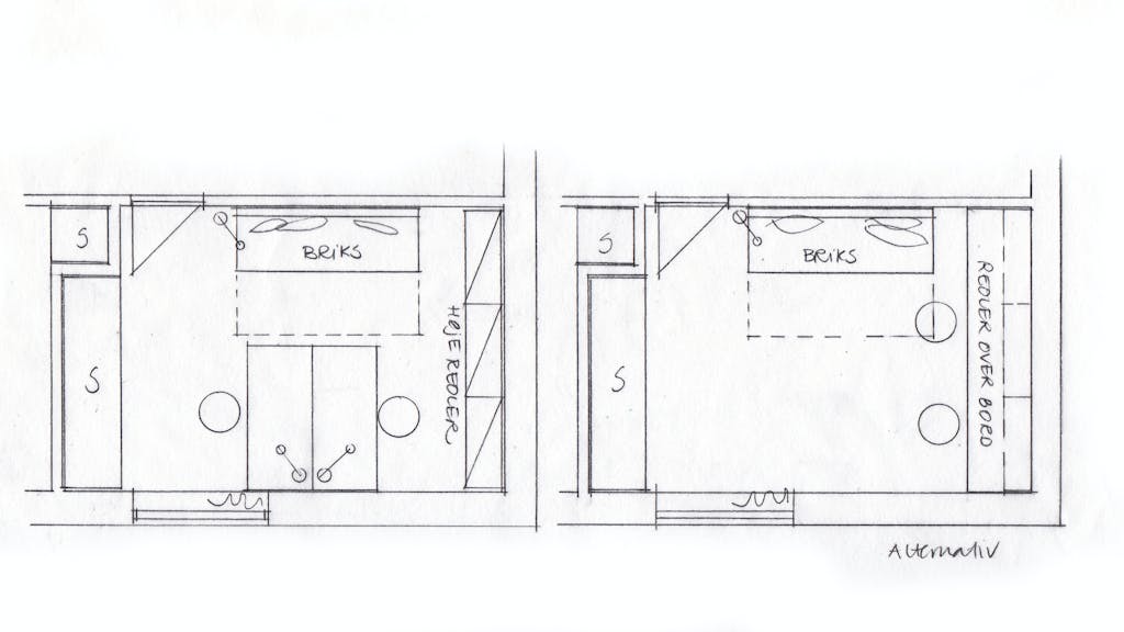 Et alternativ kan være at stille briksen på samme sted og så placere en lang bordplade på den 3 meter lange væg med væghængte reoler hele vejen oven over bordet. Det giver god gulvplads, og eventuel plads til et lille møbel og spejl til venstre for vinduet, men her kommer I begge til at sidde med ryggen til døren og uden kontakt til vindue og verden udenfor, hvilket bare ikke er lige så rart.
