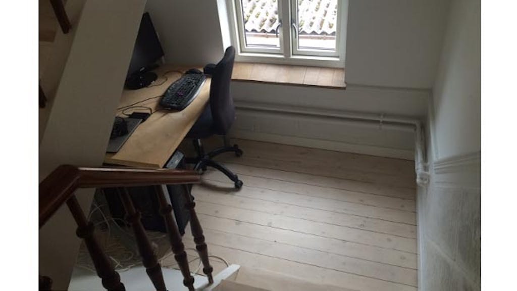 Vi har overtaget en gammel villalejlighed, og bor på 1. og 2. sal. Den gamle trappe ned til stueetagen, hvor vores underbo bor, er blændet, og der er således skabt en fin lille repos. Det er her vi lige nu har stillet vores skrivebord og computer, men vil gerne også have vores andre kontorting (printer, mapper, papir, etc her, så det ikke, som nu, står på vores søns værelse i reoler.