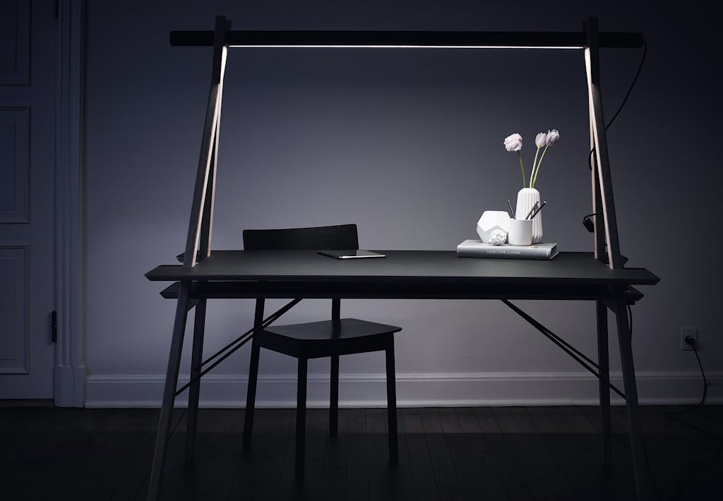 Et arbejdsbord, hvor både belysning, strøm og ledninger er tænkt ind i designet.