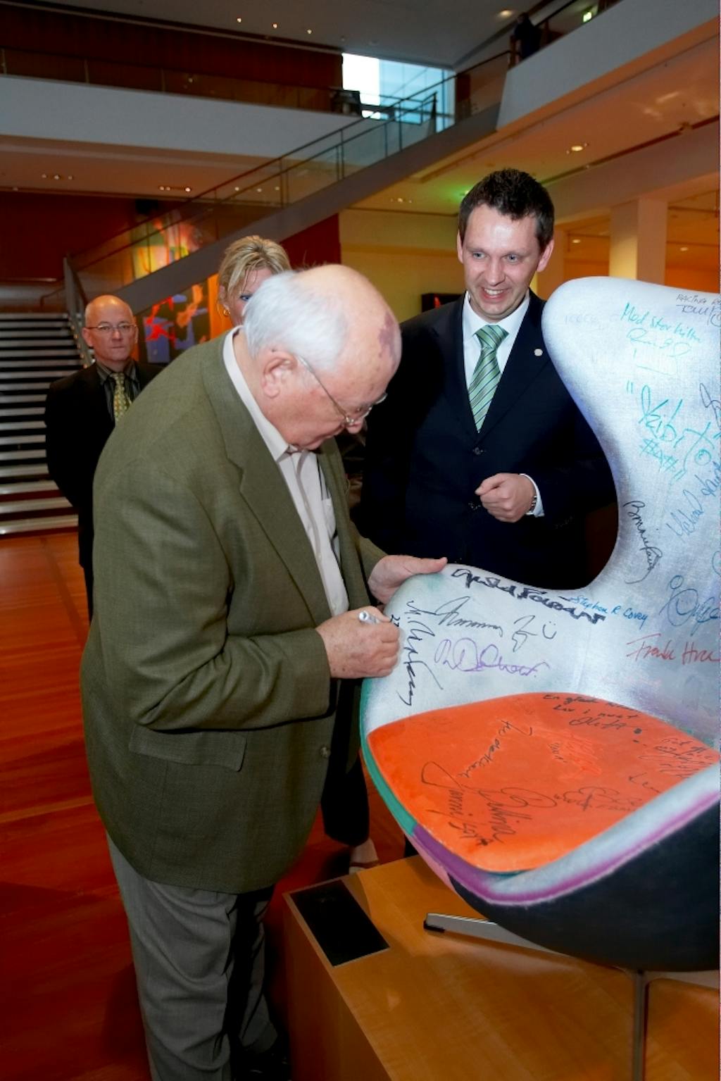 Og det er en perlerække af berømtheder, der har sat deres underskrift på stolen, og indbefatter alt fra politikere til musikere og sportsstjerner. Blandt autograferne finder du blandt andet Vigoo Mortensen, Mikhail Gorbatjov, Deepak Chopra, Benazir Butto, Ban Ki Moon, Frank Hvam, Casper Christensen, Kim Bodnia, Tom Kristensen, Angela Merkel og Michael Laudrup. Stolen er vurderet til minimum 50.000 kr.