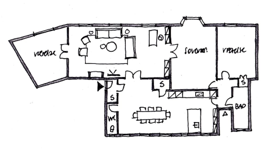 For ikke at få direkte forbindelse mellem alrum og det lille gæstetoilet, vil jeg foreslå at I flytter døren til toilettet til det lille skabsrum, så der kommer to døre imellem toilet og spis.