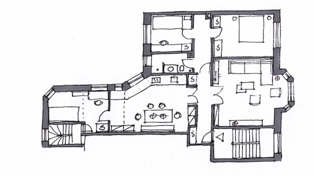 Du finder ofte løsninger, hvor man ved at flytte på køkkenet, kan finde plads til et værelse mere. Vi har et lille køkken med tilhørende pigekammer samt to store stuer og to værelser, men fordelingen kan vi ikke få til at passe.