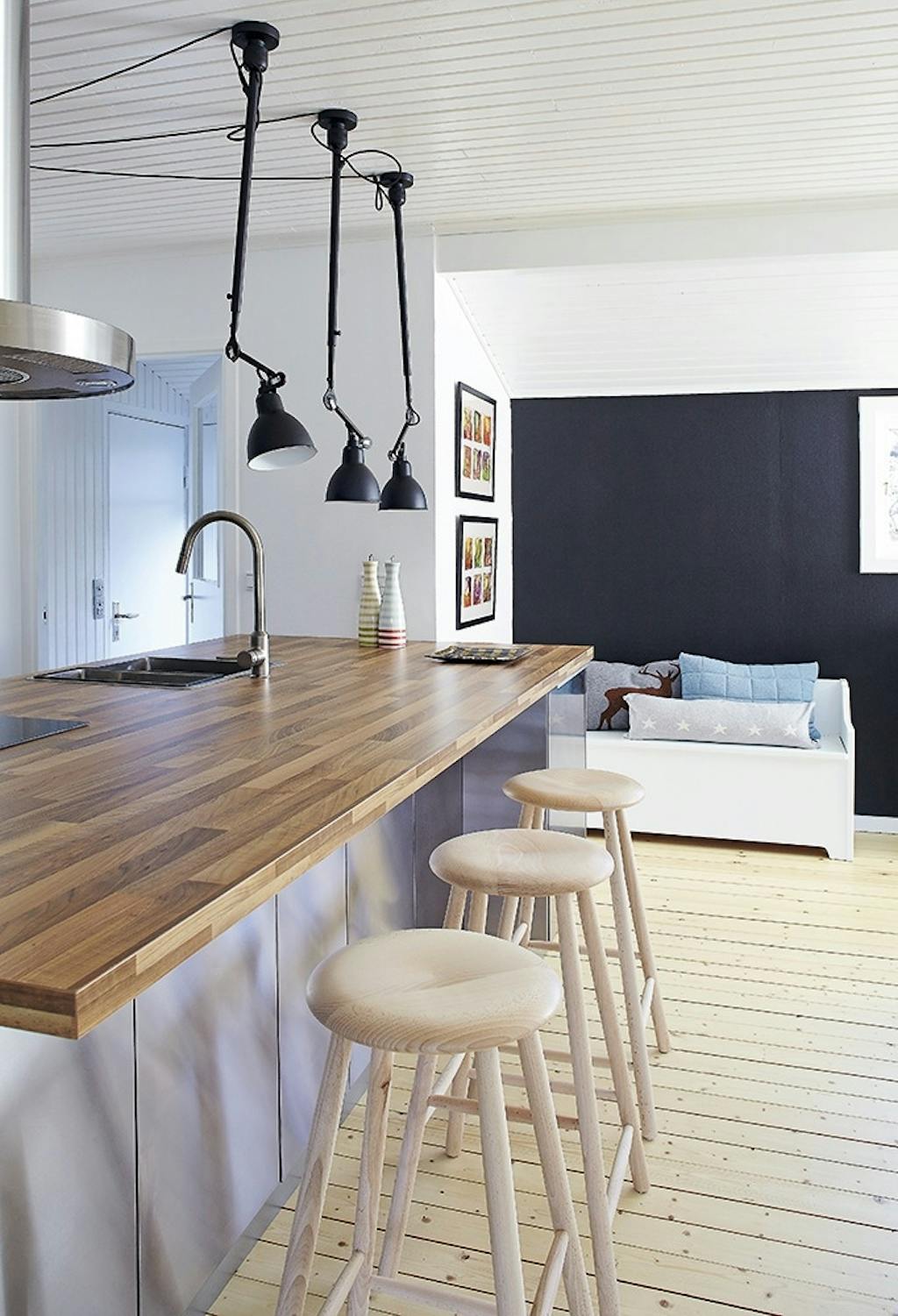 At male væggen sort. Vi foreslog selv, at det blot blev den lille væg ved siden af køleskabet, der blev malet, fordi vi var bange for, at rummet ville virke for mørkt. Men vi er simpelthen så glade for farven, at vi allerede har besluttet også at bruge den i vores anden stue. Vi havde heller ikke fundet på at fjerne gardiner og sætte et simpelt rullegardin op. Selvom det ikke er sjældent med rullegardiner, så har det haft en kæmpe effekt for rummet. Vi havde heller aldrig fundet på at skille vores gamle skab ad, så toppen kom op på væggen over køkkenbordet og nederste del ind under vinduet. Sidst, men ikke mindst havde vi heller aldrig kastet os ud i at male loftet - det havde vi ikke haft mod til. Men det er blevet så pænt og er med til at gøre rummet større.