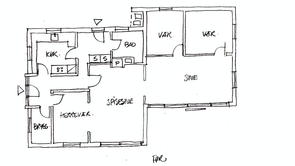 Vi vil gerne have forslag til en bedre indretning med et større badeværelse med plads til kar og brus, tre værelser og meget gerne udnyttelse af de ”spildte” kvadratmetre. Vi kan tilføje at både bad og køkken er de oprindelige fra huset blev opført, så de står under alle omstændigheder til udskiftning. Bryggerset er småt men der er plads til vaskesøjle og overtøj, så det ændrer vi ikke. Vi håber meget at du får tid til at kikke på det.