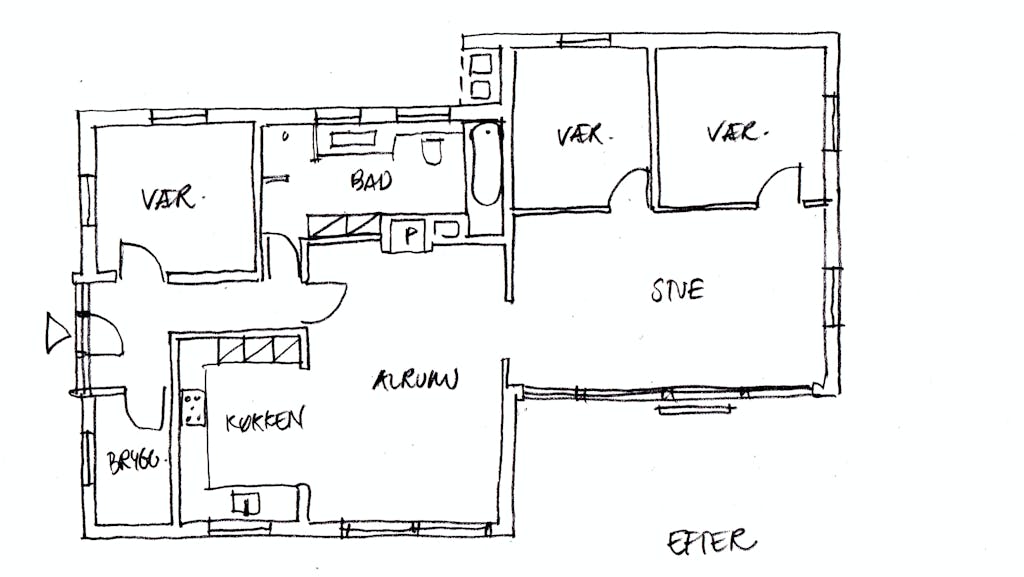 Der skal jo blændes et par døre, og opsættes ny dør til badeværelset, hvor I kan genanvende døren til herreværelset, hvilket I kan se på tegningen, og så skal der lægges nyt trægulv i det nye værelse, men ellers er den største udgift badeværelset, der skal have støbt nyt sammenhængende gulv ligesom der skal etableres nyt el både her og i køkkenet. Trods et mindre grundareal virker huset velindrettet og praktisk, så I bliver helt sikkert glade for at bo der.