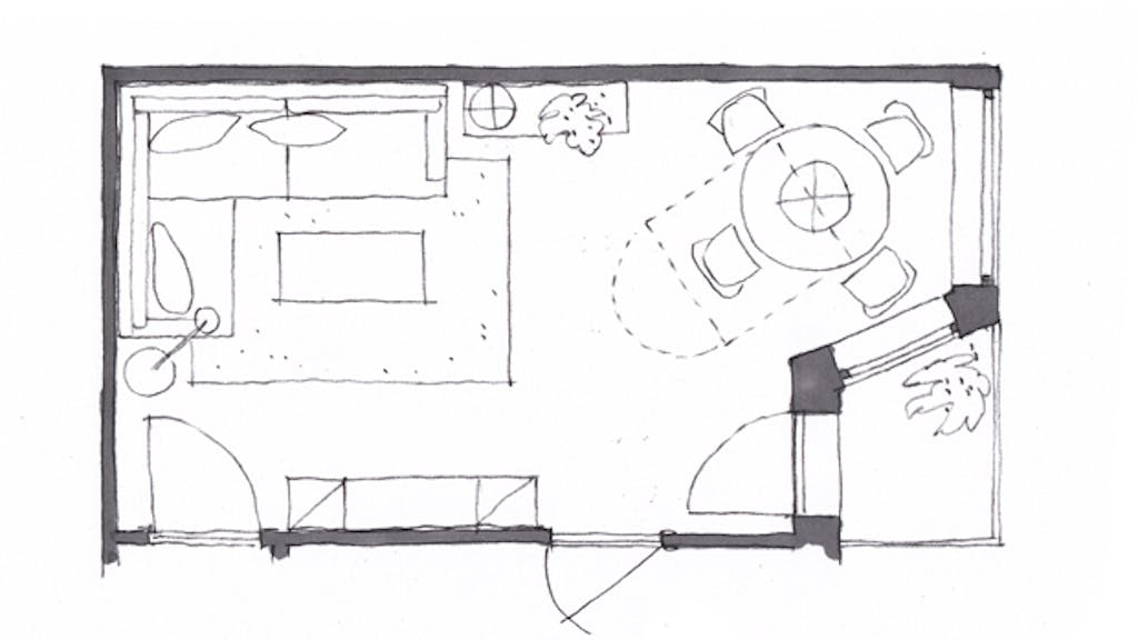 Så er det blevet min tur til at spørge om hjælp til indretning. Jeg er blevet ejer af en skøn lille lejlighed, hvor stue og spiseplads skal kombineres. Jeg har dog svært ved selv at vurdere, hvilken type møbler der skal bruges. Skal der være én stor eller to små sofaer, måske en sofa med chaiselong - og skal jeg vælge et firkantet eller rundt spisebord. Det eneste som ligger fast er, at væggen mellem døren til soveværelse og entréen forbliver møbleret som den er.
