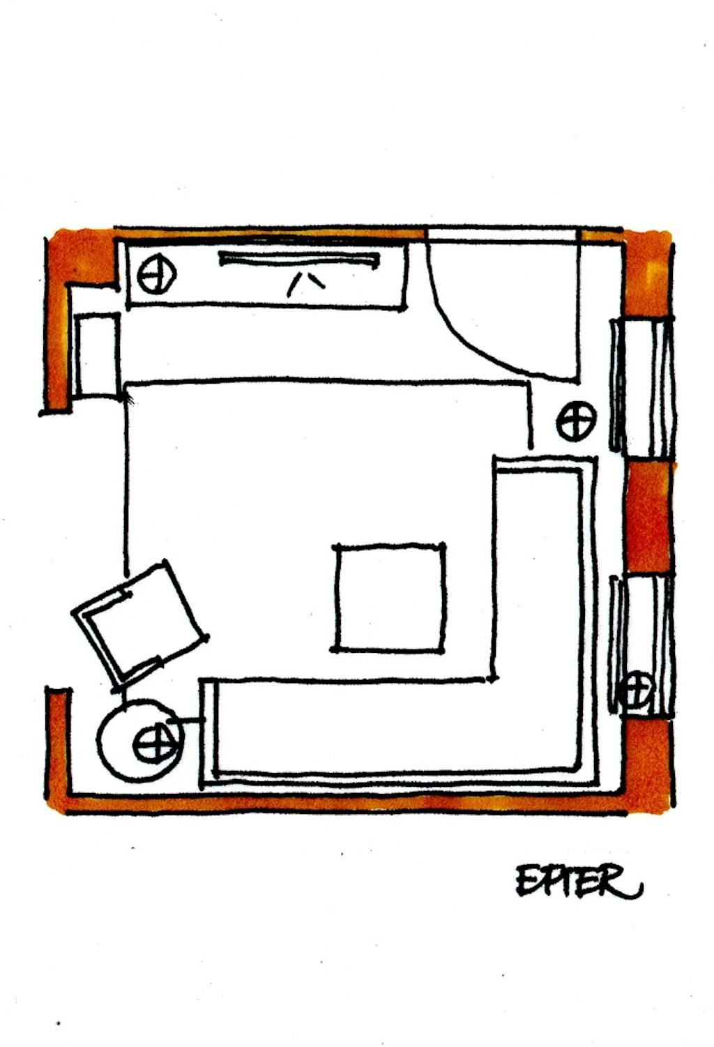 Den vedhæftede tegning, som det er nu, er ret almindelig og kedelig. Og lige nu står sofabordet i samme retning som vores spisebord, hvilket virker forkert.