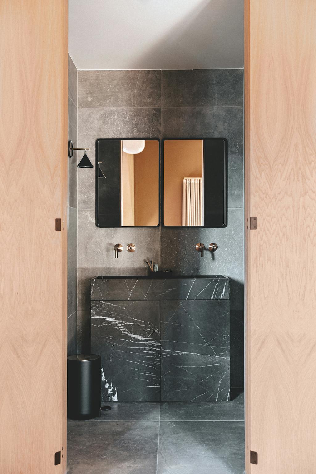 Alle badeværelser har forskellige vaske i marmor, som er fundet i Portugal og derefter designet af Norm Architects. Armaturet er fra Axor, spejl fra Menu, og fliser fra Kronos Ceramiche.