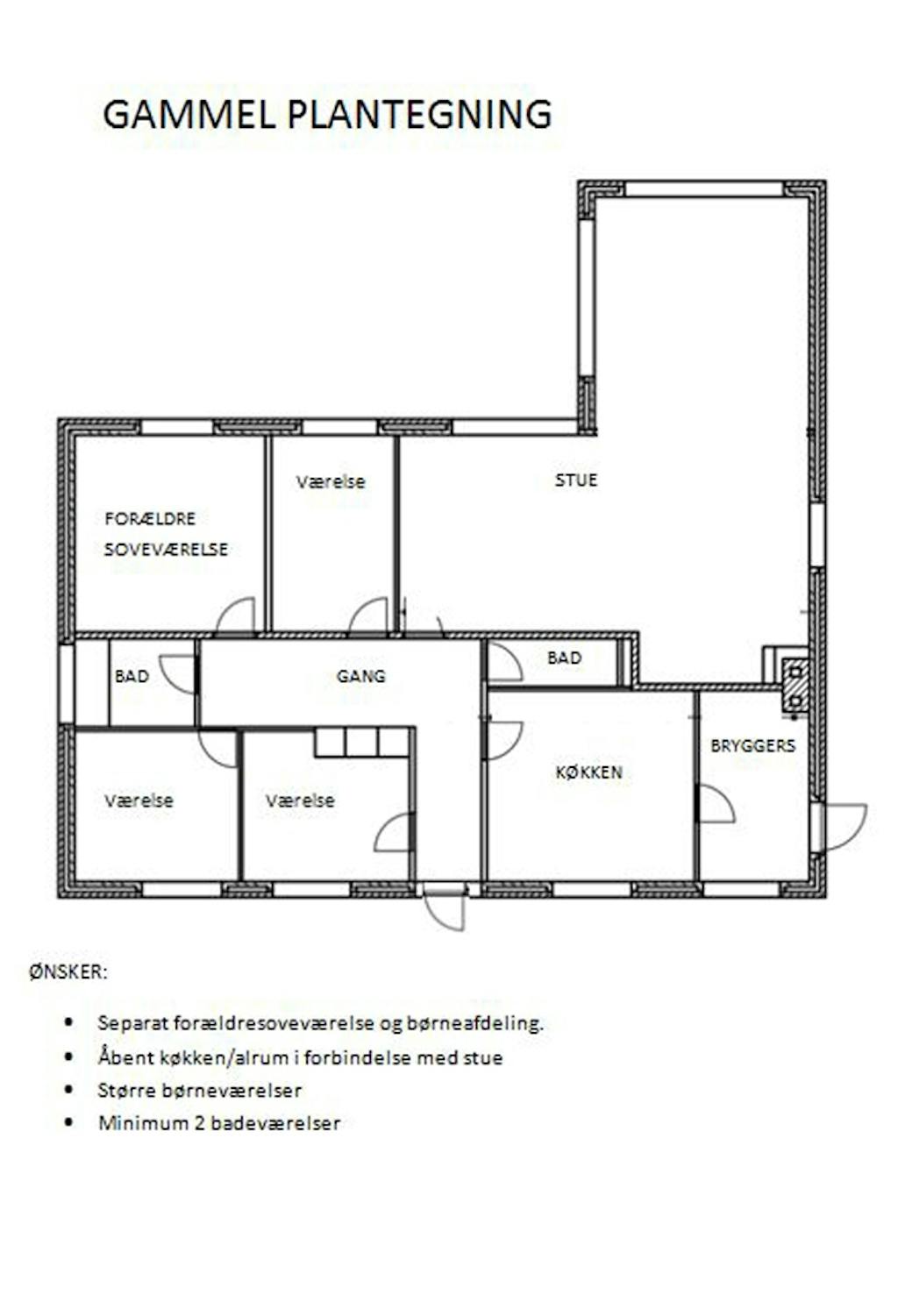 Kan du se løsninger i den nuværende plantegning, som kan efterkomme vores ønsker eller en mere optimal løsning inkl. den ny tilbygning? (Vi ønsker os separat voksenafdeling og børneafdeling, større alrum ved stuen, større børneværelser og to badeværelser.