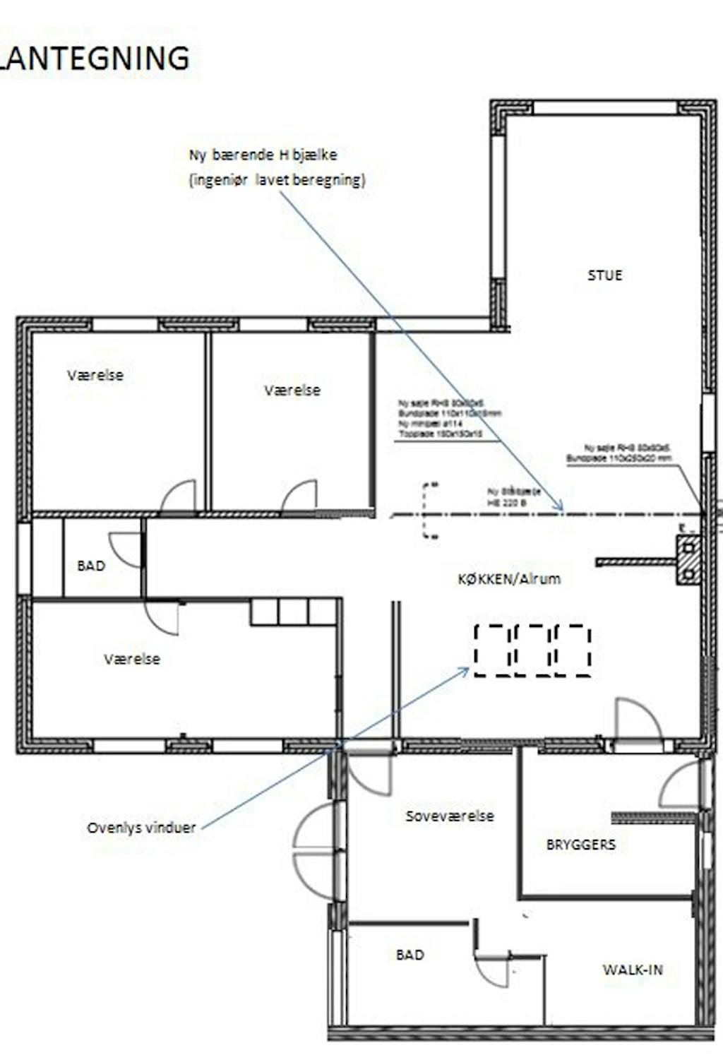 Vi vil selvfølgelig helst ændre indenfor eksisterende rammer, men kan ikke se, hvordan det kan lade sig gøre. Derfor har vi tilføjet en tilbygning på ca. 56 kvadratmeter. (8 meter langs nuværende væg og 7 meter ud)