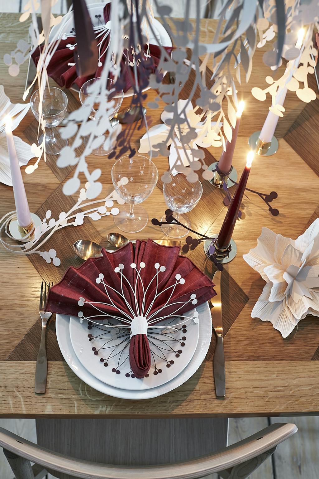 De levende blomster er hos Amanda erstattet af foldede, origamilignende kuvertbuketter. De gør indtryk med de mange lag og vidner om, at bordpynt kan opstå i
