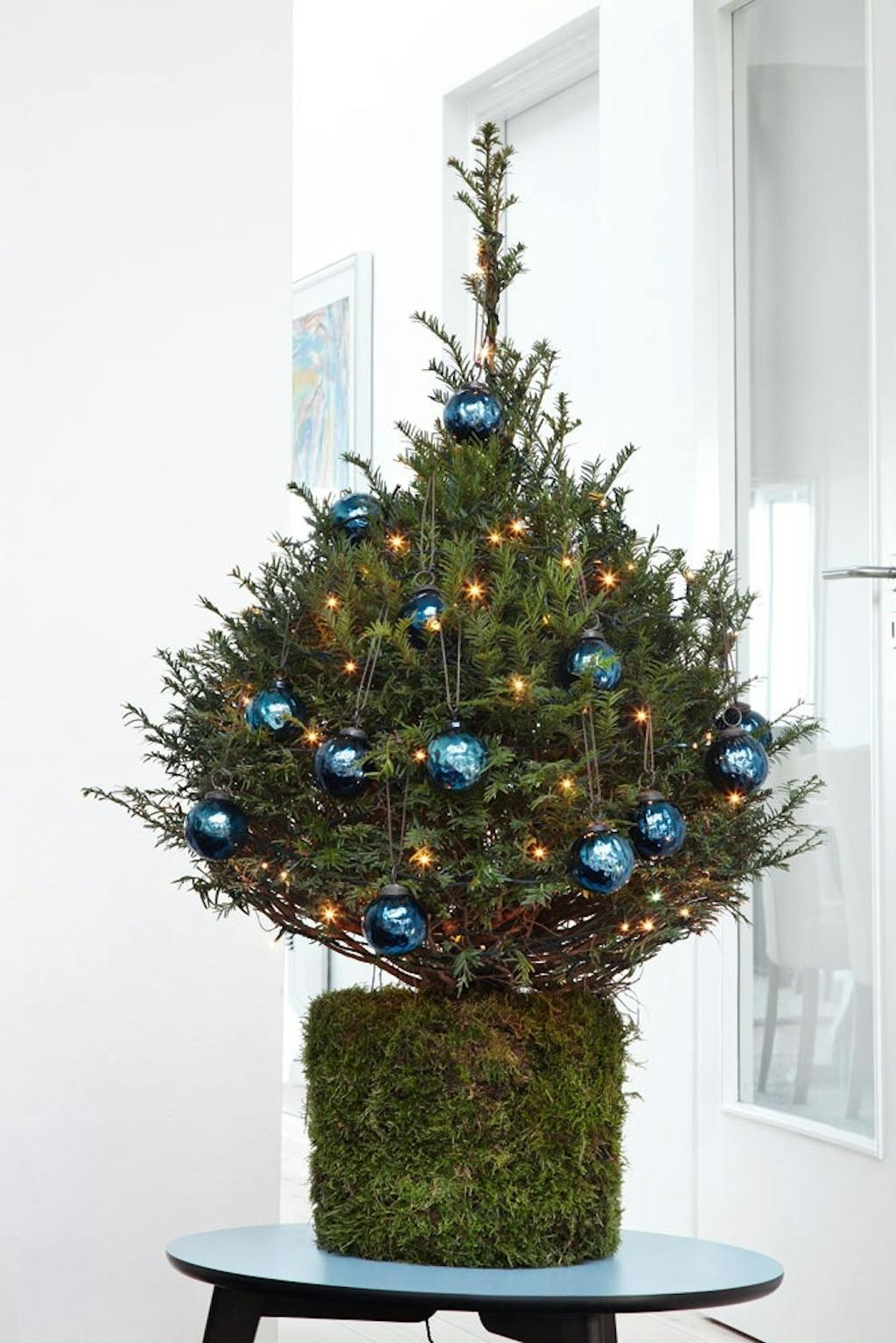 Stærkt design og grønne ideer. Dyrk dit eget bære-dygtige juletræ. Hvert år til jul graves træet op med rod og tages ind. Sidebord med juletræ, Beck, designet af Anders F. Andersen, h 30 cm, diam. 60 cm, 3680 kr., Foxy Potato. Julekugler, Harlequin, fra 25 kr., House Doctor. Øreklapstol, Black Raven, designet af Peter Ingwersen, 10.800 kr., raun. Puder, lilla pude, 40 x 40 cm, 425 kr., Massimo Interior, silkepude, Alvis, 610 kr., Fanny Aronsen. Bakkebord, Tray Table, metal, 40 x 40 cm, 999 kr., HAY. Gulvtæppe, Glamour, 170 x 240 cm, 4275 kr., Massimo Interior. Reoler i baggrunden, fås i mange størrelser og farver, fra ca. 2000 kr., Montana.