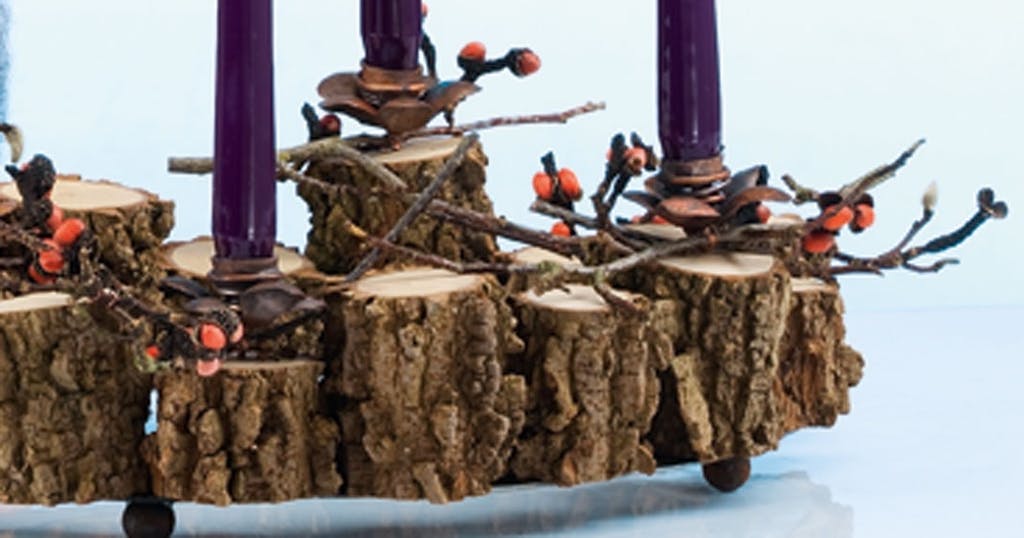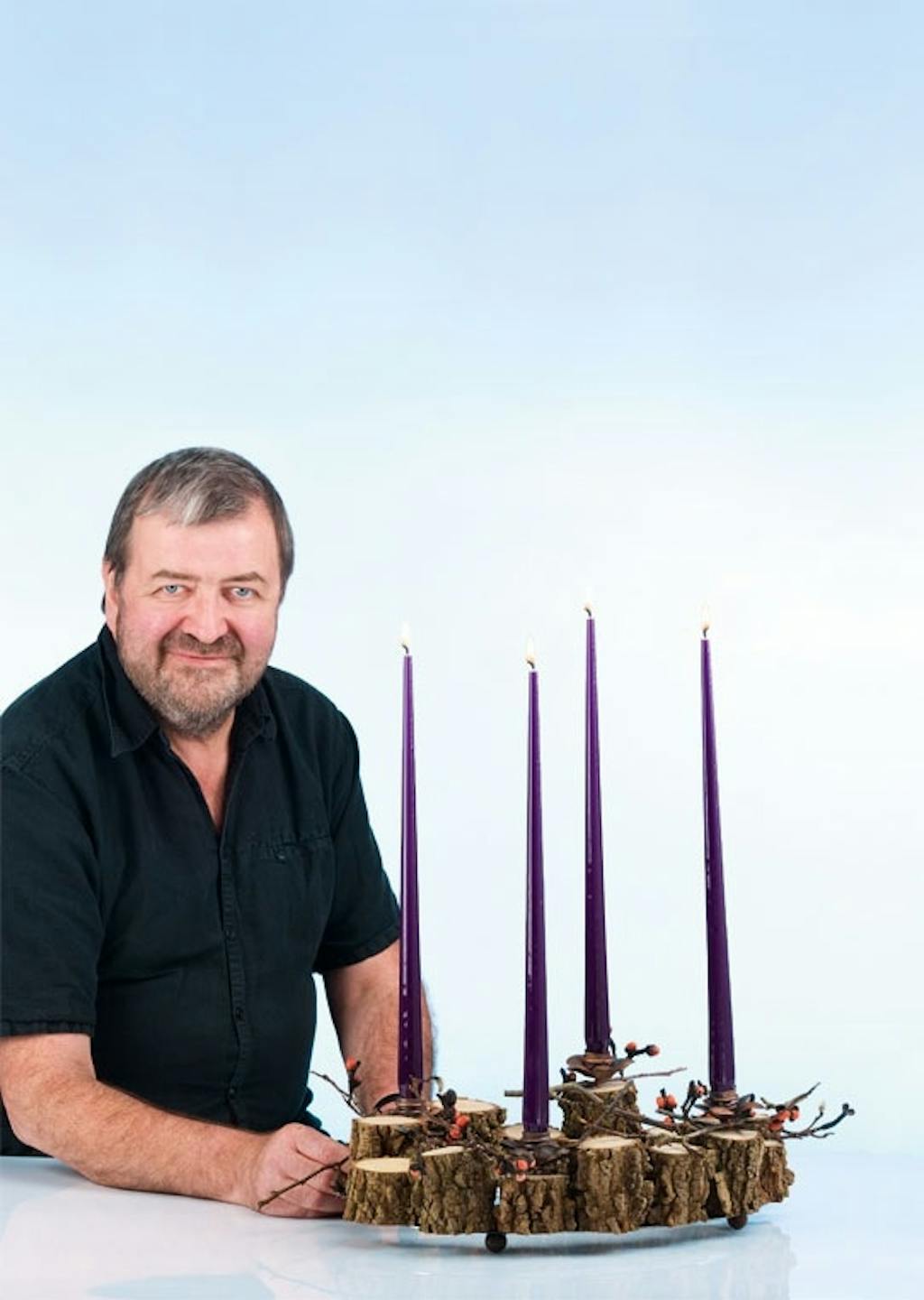 En rustik krans med røde efterårsbær og lilla laklys skaber rammen om en enkelt men effektfuld adventskrans.