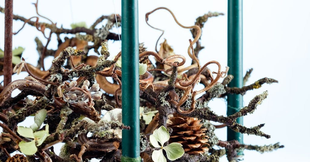 Krøllede kviste og støvgrønne fund fra den gamle Blixen-have er stukket i en pilekrans på ophæng. TIP: Skab selv en naturlig krans med afklip fra haven holdt i en enkelt farvetone fx på bordet med bloklys i midten.