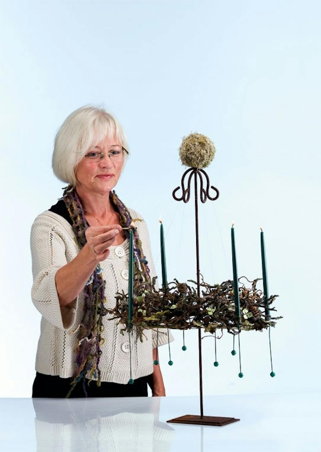 Karen Blixen var sjældent hjemme i julen, så vi har ikke så meget at gå ud fra i forhold til juledekorationer. Men hendes tilgang til blomster var meget kunstnerisk, og hun tog gerne udganspunkt i haven. Jeg har prøvet at fange hendes æstetik, hendes farver og hendes asymmetri i en naturlig og eventyrlig krans.