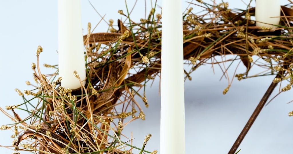 Gør adventskransen enkel men også elegant ved hjælp af flettede fyrretræsnåle og lidt guldstøv.