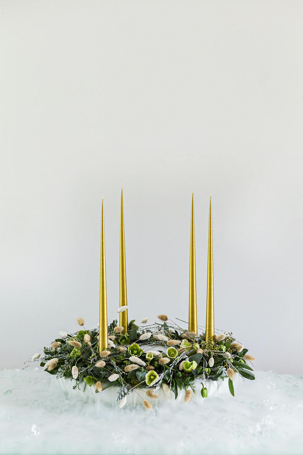 Anderledes advent. Fire lys i en stage og en adventsbuket, der kan skiftes hver uge. Annette von Einem starter julen med en tæt, kompakt buket bundet med skabiosafrøstande, nogle med lidt glitter, i selskab med fine, lette fyrregrene og juleroser, der elegant og let svæver henover med et fald til den ene side. Vasen og lysestagerne er fra Slim-serien fra Hove Home, og lysene er fra Ester & Erik. Marmorfadet fra Bahne skal være synligt som en del af dekorationens udtryk.
