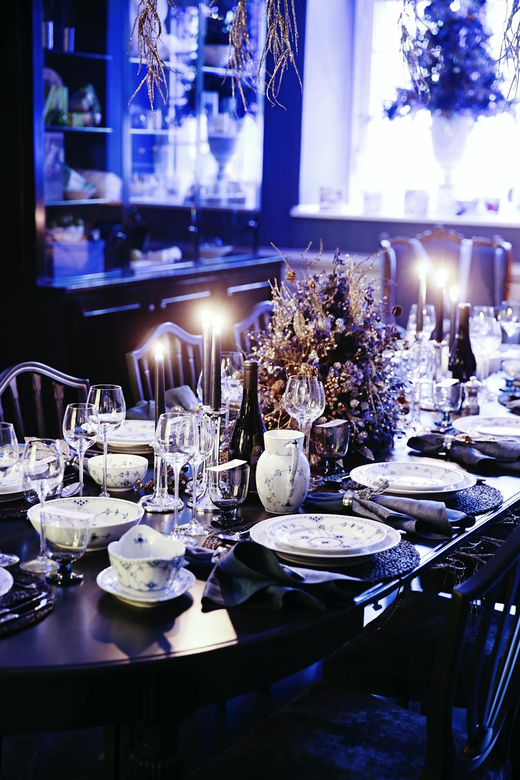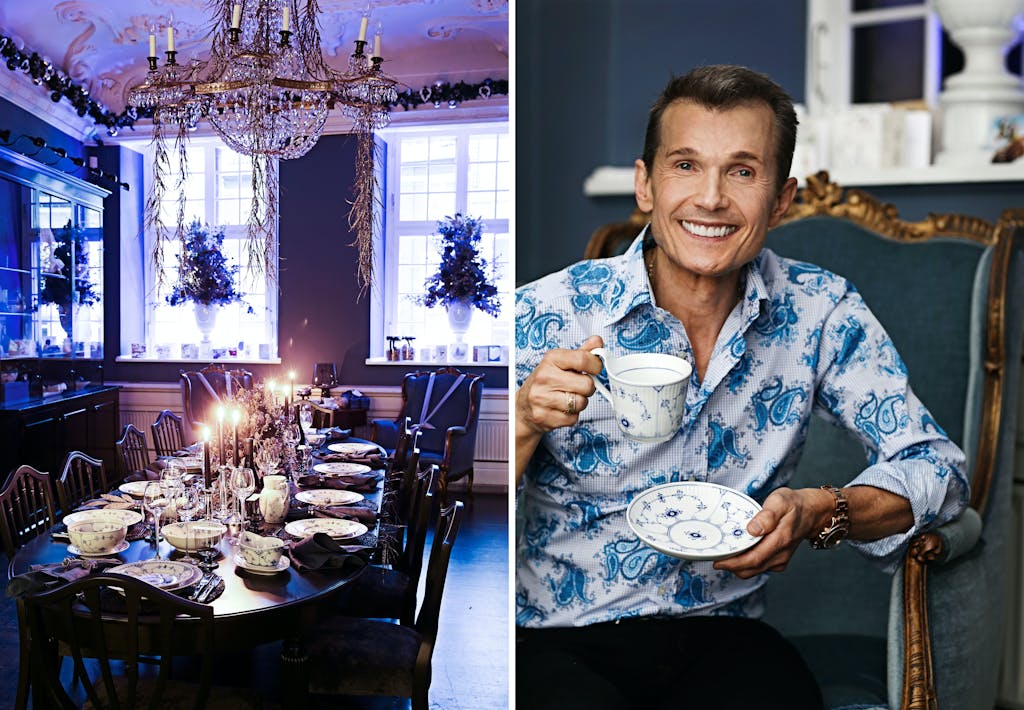 Thomas Evers Poulsen danser på bordet Der bydes op til dans og storslået middag, når danseren Thomas Evers Poulsen inviterer indenfor til overdådig julemiddag. På det runde bord er dækket op med krystal fra fyrrene og Sort Mega Riflet, som er et af de mange Royal Copenhagen stel, der har skrevet designhistorie.Thomas Evers Poulsen har dækket op med stellets smukke fade, som her bruges som tallerkener, så julemaden kan præsentere sig bedst muligt.